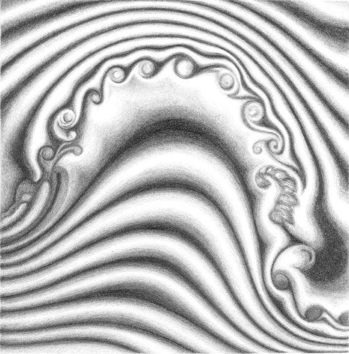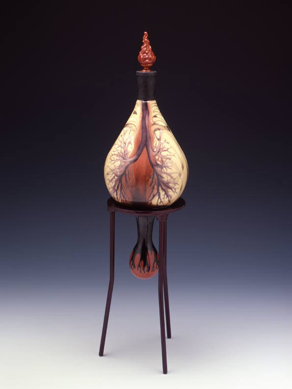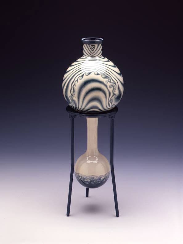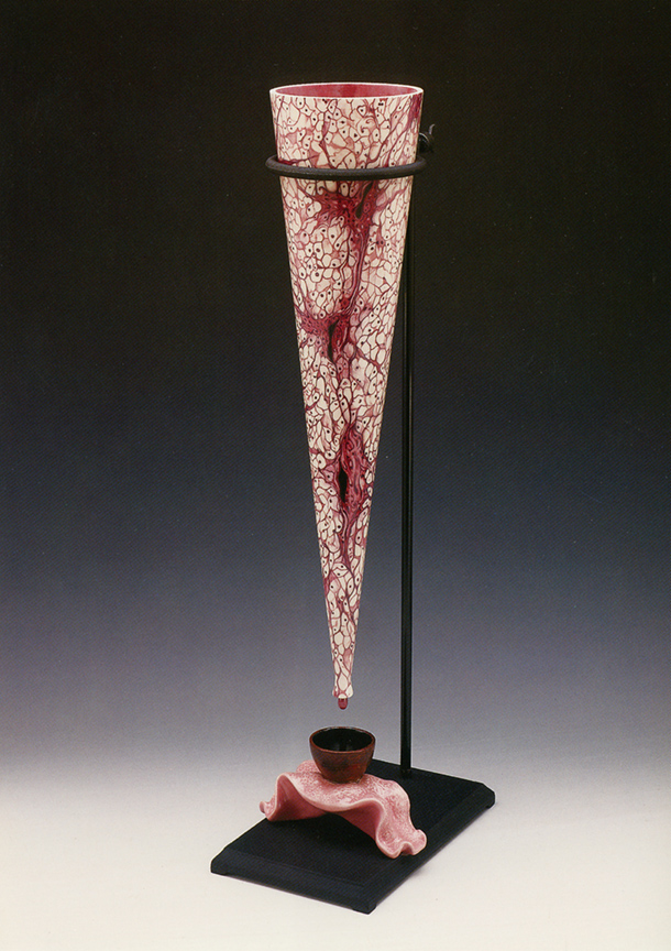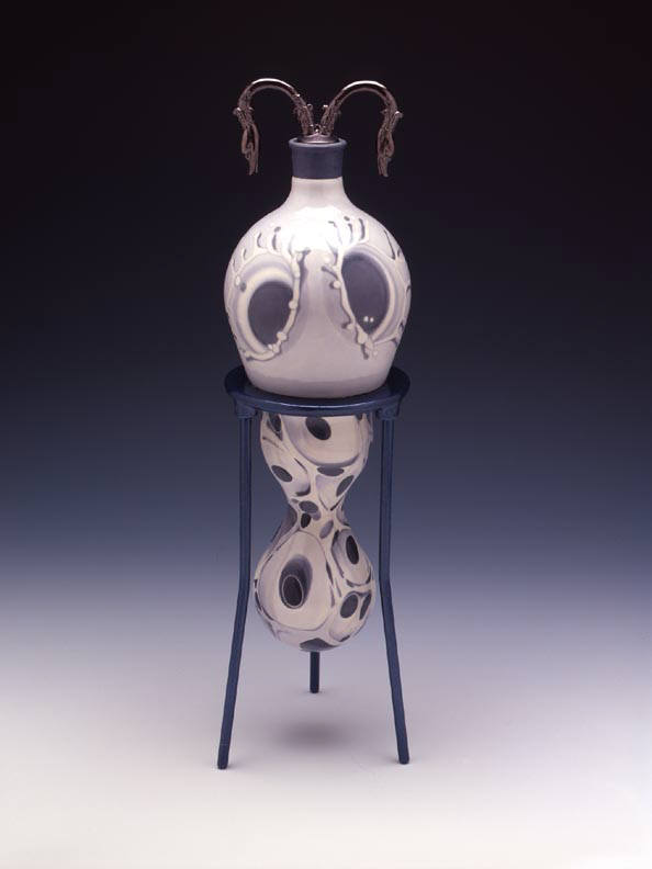 In a one person show at the Frank Lloyd Gallery from February 26 – March 26, 2005, Cindy Kolodziejski presents new work. Nine sculptures display her masterful painting on distinctive new ceramic forms. These elegant, unusual vessels are distorted until they seem to drip and slide through the metal stands on which they hang. Their glazed surfaces display patterns ranging from cellular structures to soap bubbles, and much of the imagery revolves around the ebb and flow of liquids. Kolodziejski will also present five intricately rendered graphite drawings of related forms and patterns.
