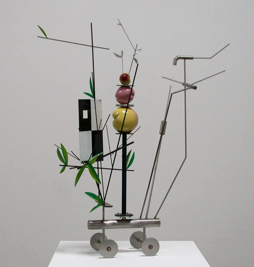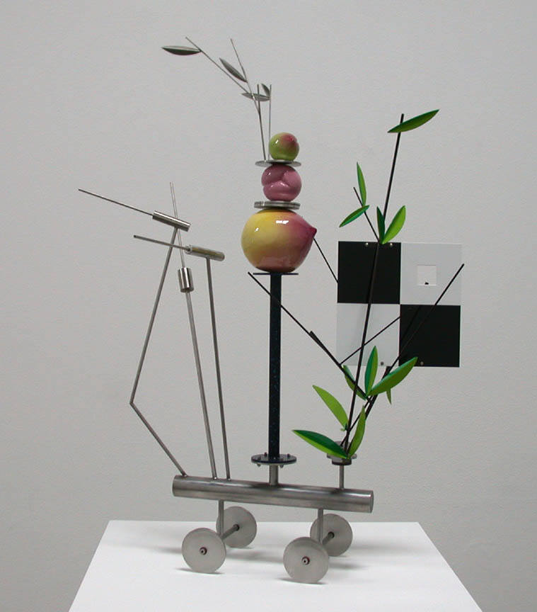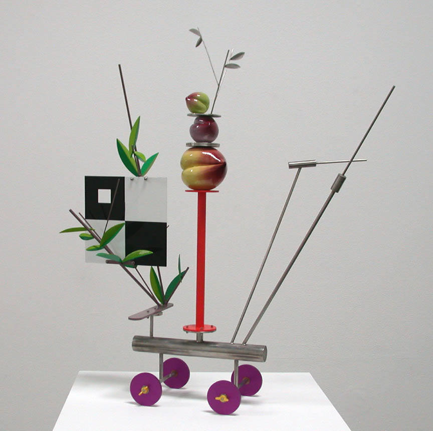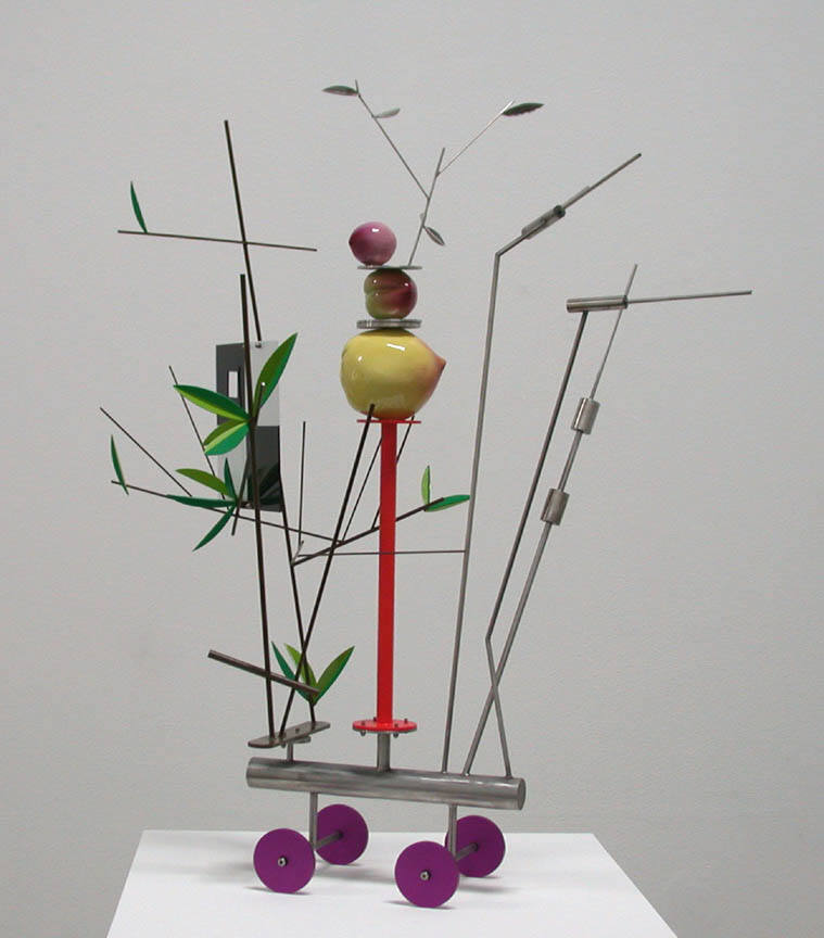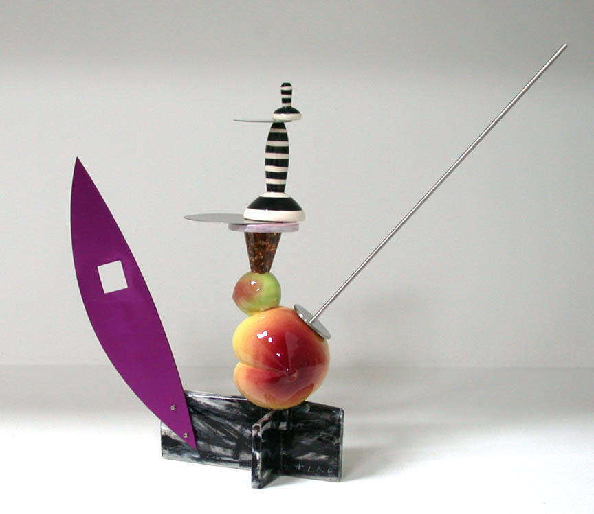 In a one person show at the Frank Lloyd Gallery from May 13 to June 17, 2006, Peter Shire will present new ceramic and metal sculpture. Two new fountains, configured as large vertical stainless steel sculptures, demonstrate Shire's well-known playful constructivism. The most recent work often combines ceramics and steel. In one group of towering teapots, the metal serves as structure in counterpoint to the organic shapes of peaches. In another group of ceramic teapots, the steel elements are used as fanciful ornamentation.