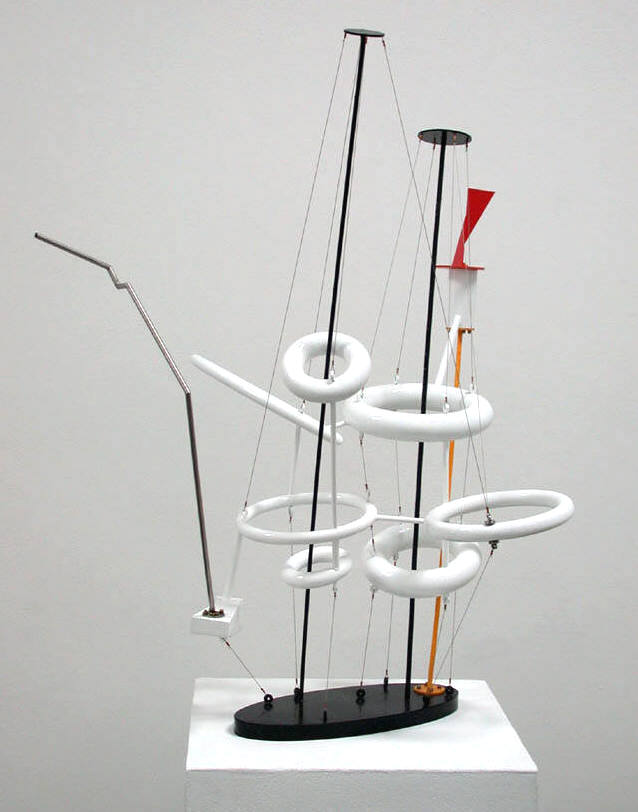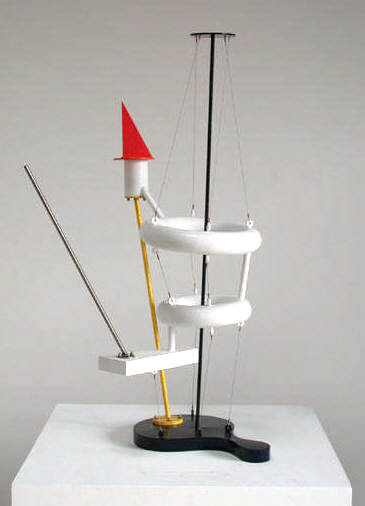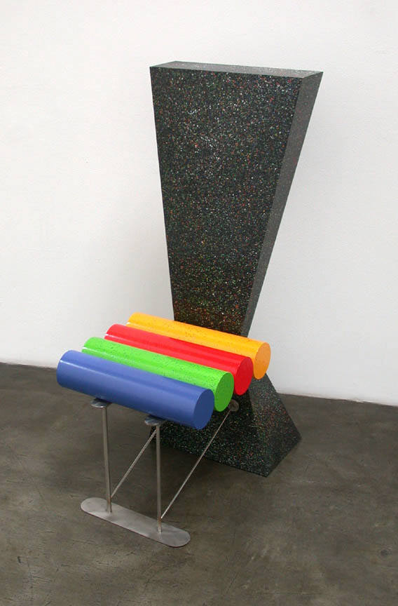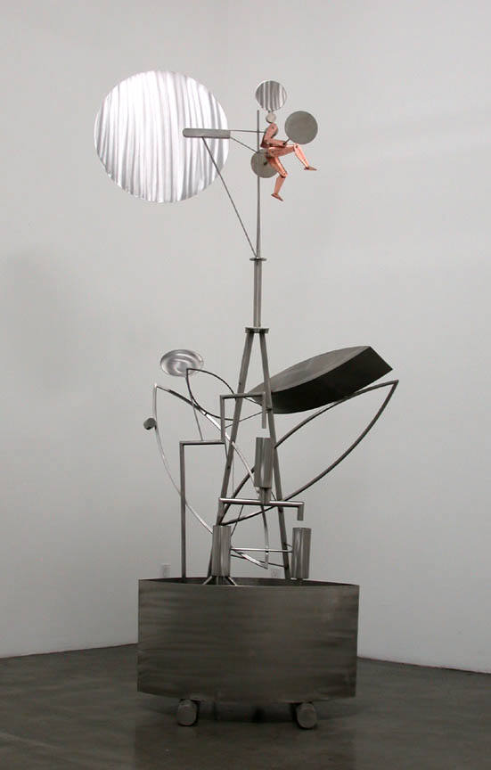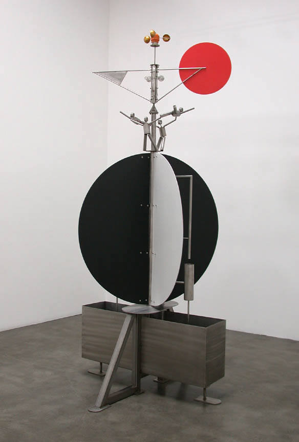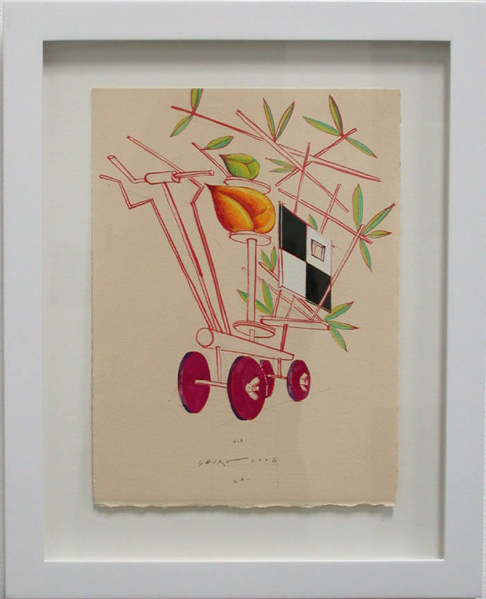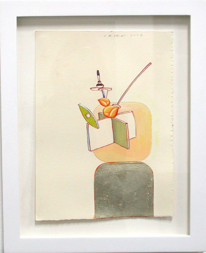 In a one person show at the Frank Lloyd Gallery from May 13 to June 17, 2006, Peter Shire will present new ceramic and metal sculpture. Two new fountains, configured as large vertical stainless steel sculptures, demonstrate Shire's well-known playful constructivism. The most recent work often combines ceramics and steel. In one group of towering teapots, the metal serves as structure in counterpoint to the organic shapes of peaches. In another group of ceramic teapots, the steel elements are used as fanciful ornamentation.