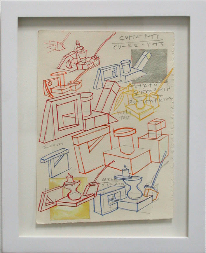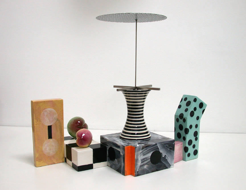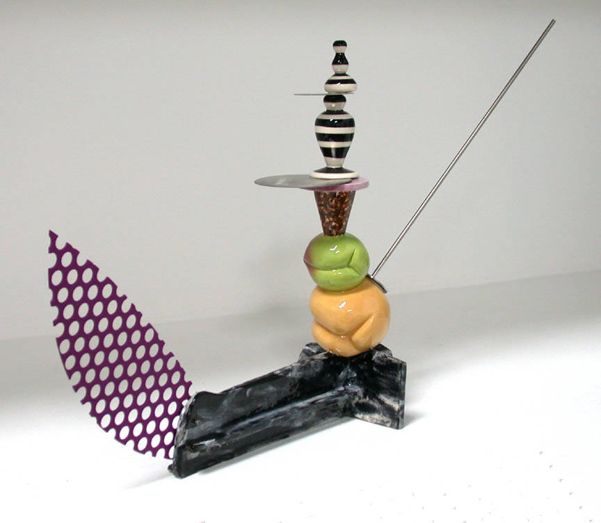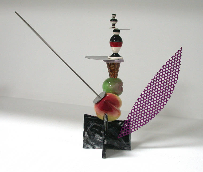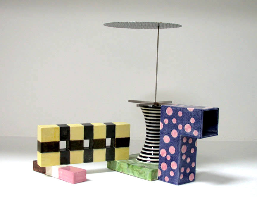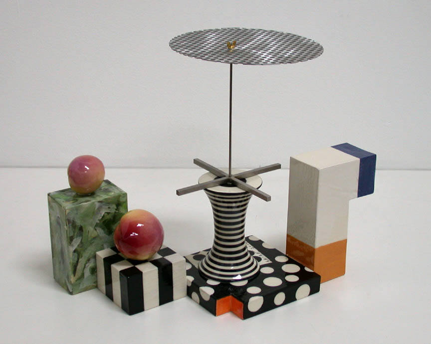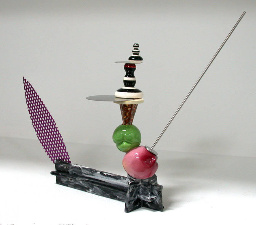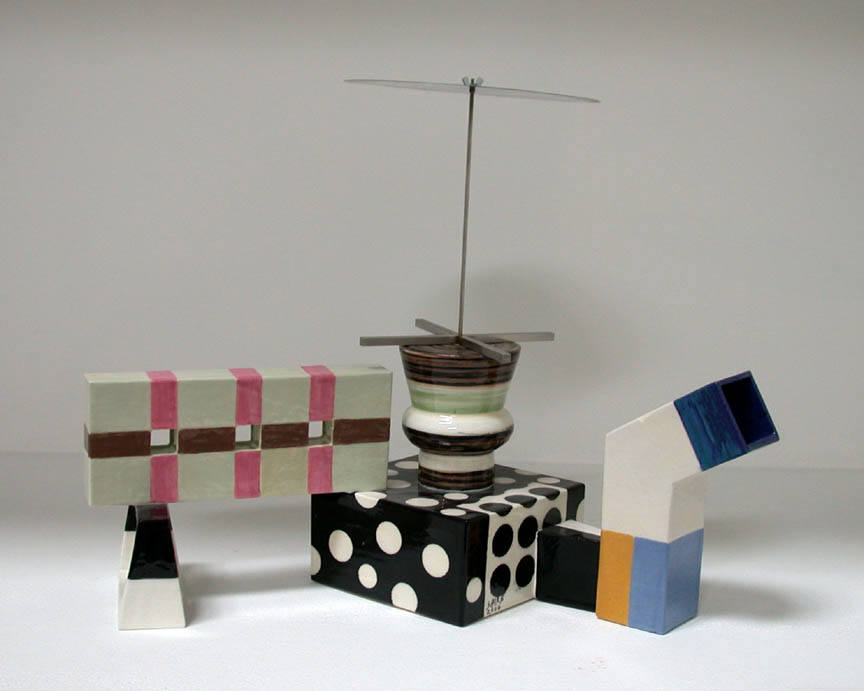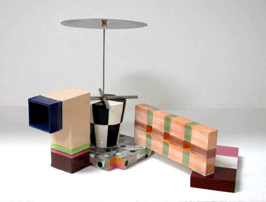 Skewed angles, geometric abstraction and a savvy design sense define Shire's ceramic constructions, which often have functional roots. Stretching functionality to its limits, Shire builds teapots that play with the boundaries between sculpture and industrial design. Shire's work, which has also included furniture and architectural design, is on view at the Los Angeles County Museum of Art in conjunction with the Ettore Sottsass exhibition. Several works are included in the LACMA show, which is titled Peter Shire: The Los Angeles Connection to Memphis.