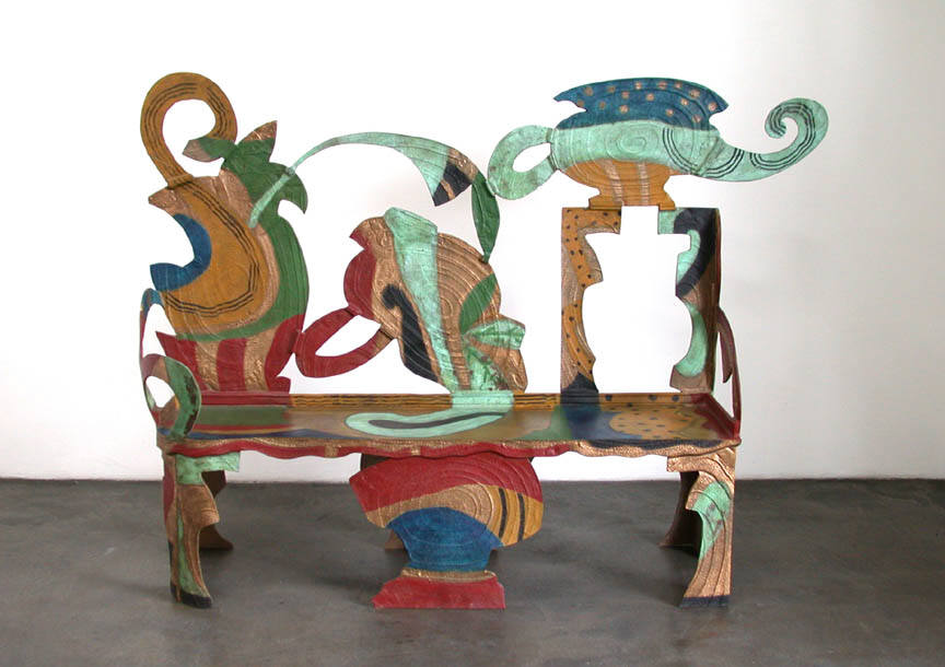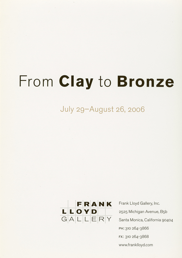 Frank Lloyd Gallery is pleased to present an exhibition of bronze sculpture by three major artists. Georges Jeanclos (1933-1997) worked primarily in a figurative mode, and used the delicate and fragile medium of terra cotta to form his work. Translated to bronze by master craftsmen at a foundry in Paris, the works evoke the tragedy of loss and reconciliation. Peter Voulkos (1924-2002) cast many of his major works in bronze during the last four years of his life, merging his life-long work in clay with his knowledge of bronze casting. Betty Woodman (b.1930) is represented in the exhibition by a bronze bench, with a delightfully colorful patina.