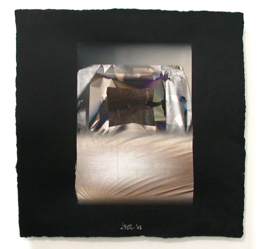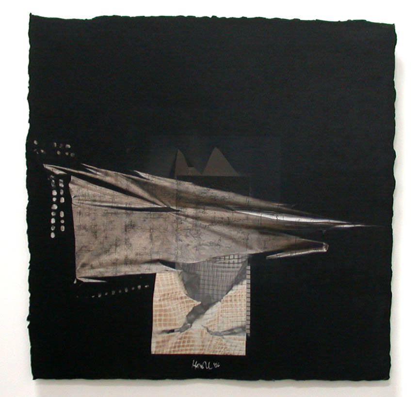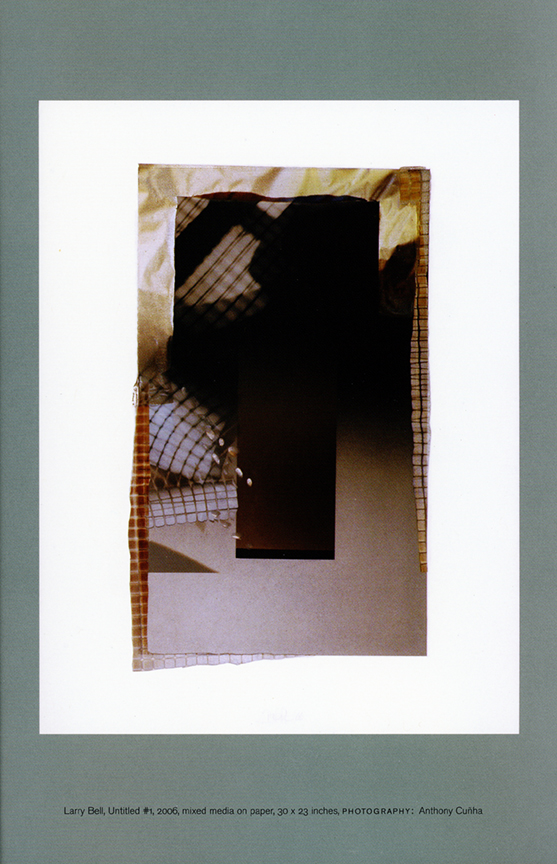 Larry Bell has investigated drawing as a support for his unique process of thin film deposition of metallic particles. Larry Bell brought his knowledge of the reflective properties of metallic coatings to works on paper in a series called Vapor Drawings. Bell, (born in Chicago in 1939), has also investigated drawing in combination the process of collage in a series of works titled Fractions, assembling portions of the Vapor Drawings with elements and components derived from the process of coating glass with a thin film of metallic particles. The open yet composed spaces in these drawings and collages are filled with light and reflection, echoing the artist's life-long interest in the properties of light and the controlled exploitation of materials.