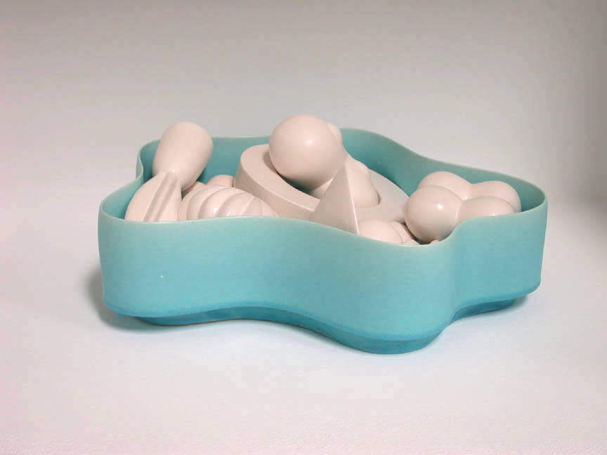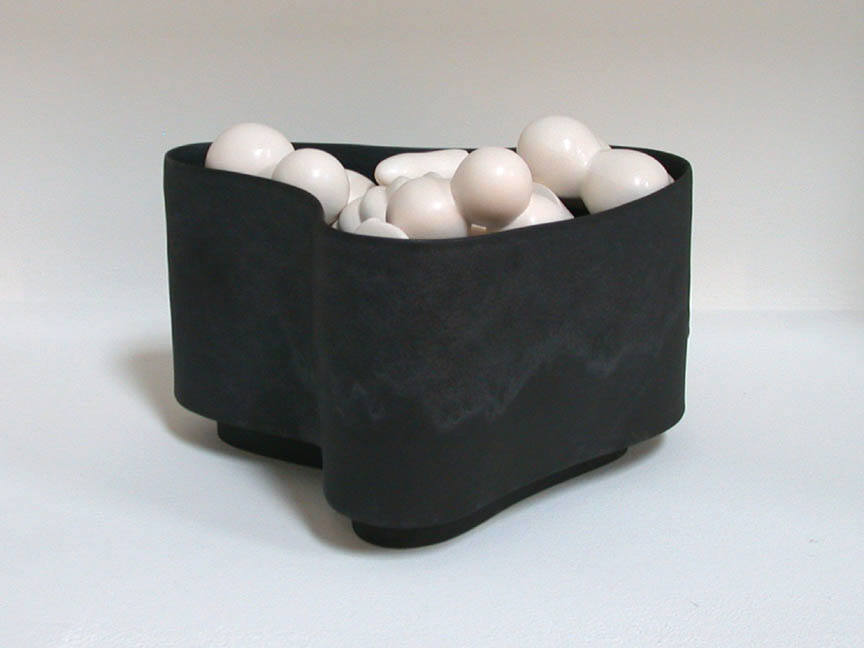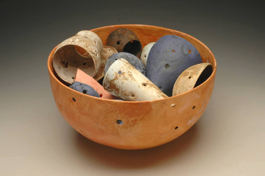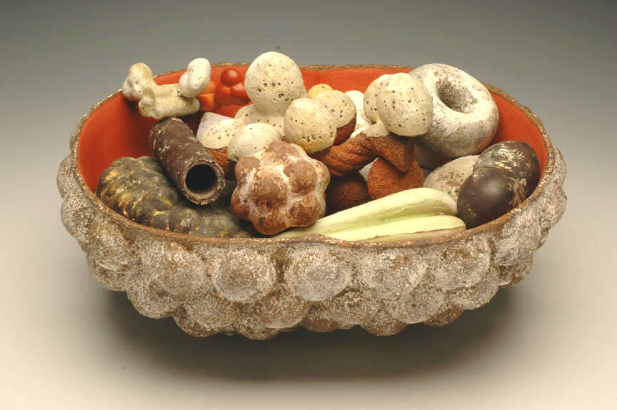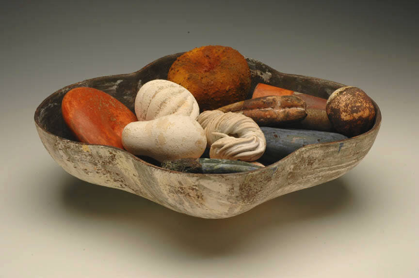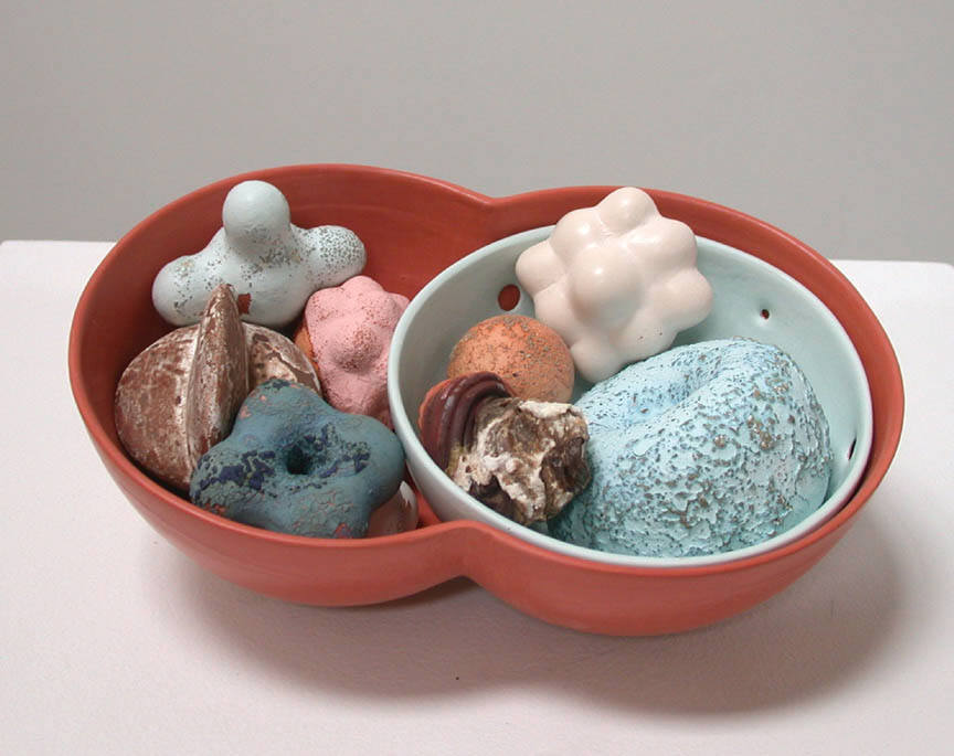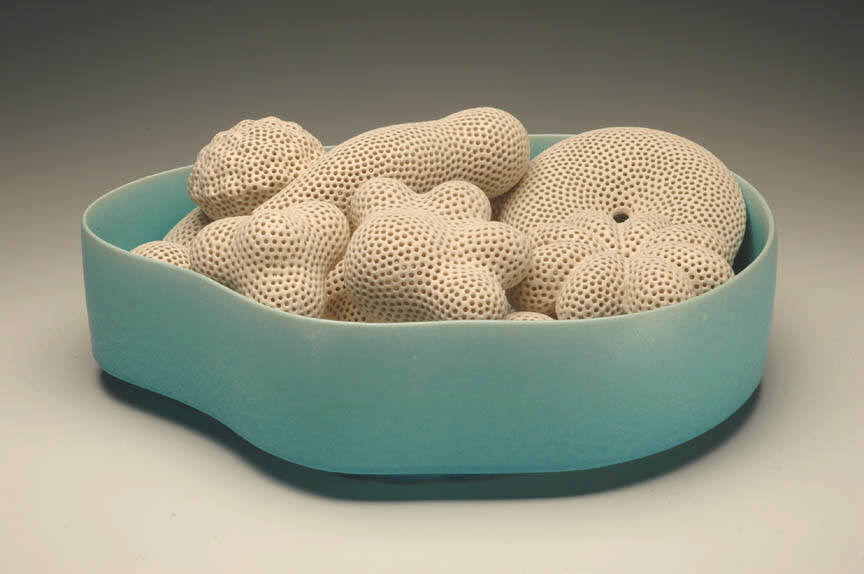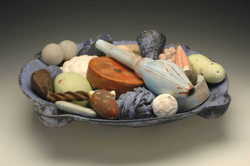 Tony Marsh will also exhibit a series of vessel-based forms filled with objects, incorporating a rich variety of tones and surface treatments. "In his Radiance and Abundance Series," as noted art writer George Melrod has written, "the vessels and their contents seem more weathered, but at the same time, more festive." Exploring both roughened, tactile surfaces and enticingly smooth, uniform surfaces, Marsh expands his range of colors to include lush reds and blues among earth tones. The forms that fill each vessel echo geometric structures found throughout nature, both at the microscopic and macroscopic levels. These shapes, familiar but mysterious in their re-contextualized state, deepen Marsh's exploration of the traditional vessel form.