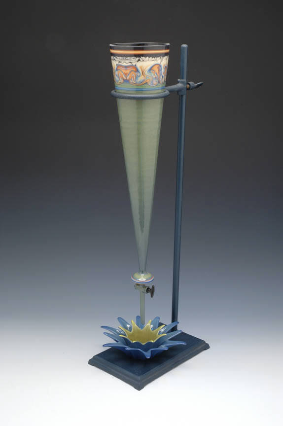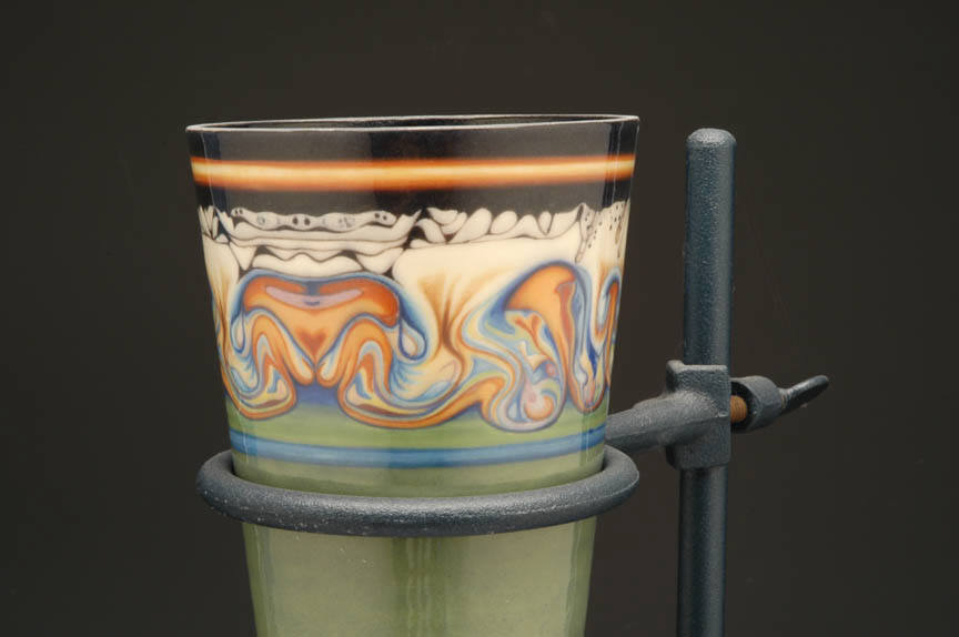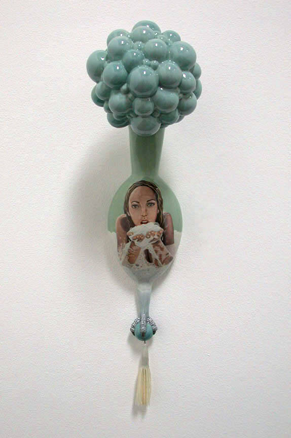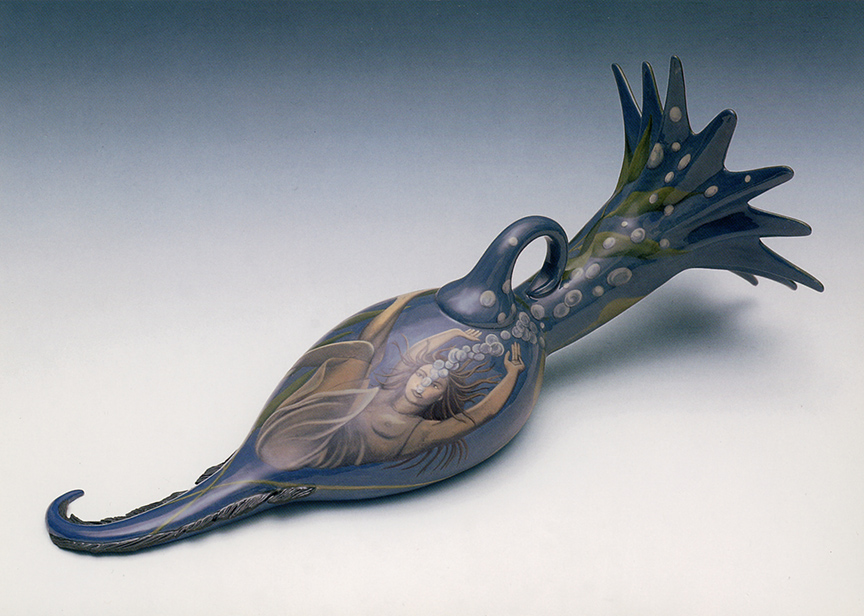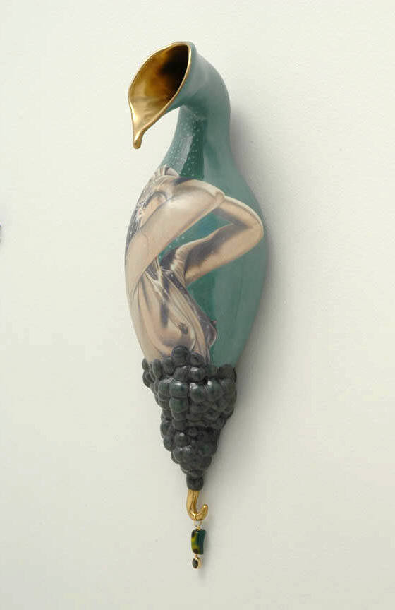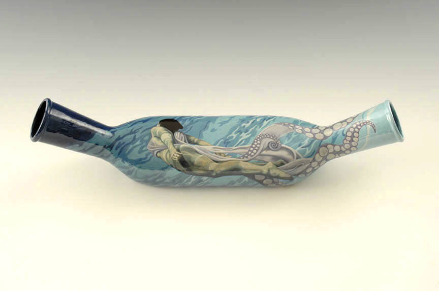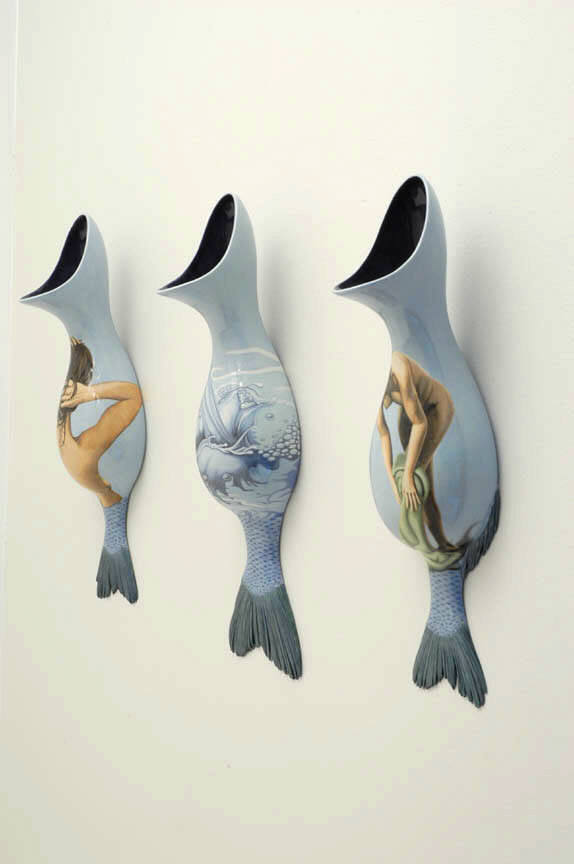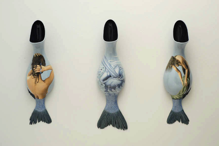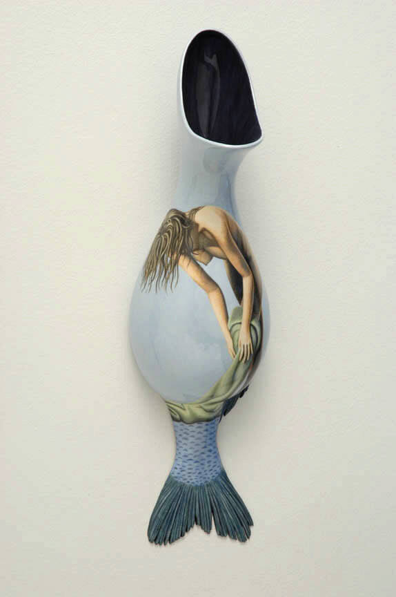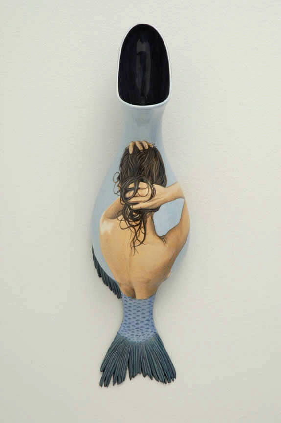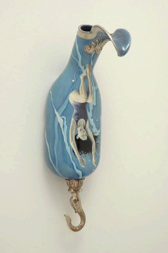 Cindy Kolodziejski makes reference to Marcel Duchamp's readymade porcelain urinal, which was exhibited in 1917. Kolodziejski's work jumps off from the starting point of antique urinals, and adds layers of imagery and metaphor. In addition to the provocative use of a container for bodily fluids, the artist entices the viewer by painting underwater scenes of women. These women seem to inhabit an enticing water world, and are depicted in various positions, floating and swimming. On other fish-like forms, the women are depicted showering or drying themselves. There are mixed references to the sea throughout—including seaweed, octopus tentacles and bubbles. It is a strange and mysterious brew of exquisitely rendered ceramic sculpture.