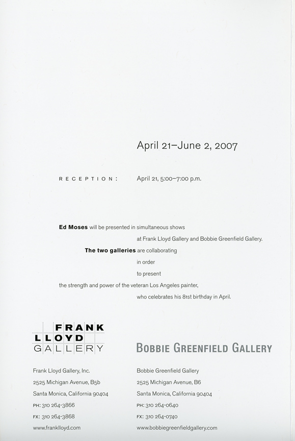 Moses (born 1926 in Long Beach) has an extensive history with the medium of painting, and his lyrical abstractions date from the 1950s. Throughout his career, Moses has focused on process, materials, and improvisation. Moses has been exhibiting since 1949, and was part of the original group of artists from the Ferus Gallery in 1957. His work was documented in a major retrospective exhibition at the Museum of Contemporary Art in 1996. Museum collections include the Los Angeles County Museum of Art, The Art Institute of Chicago, the Menil Foundation, the Museum of Modern Art, The Corcoran Gallery of Art, the Philadelphia Museum of Art and the Whitney Museum of American Art, among others.
