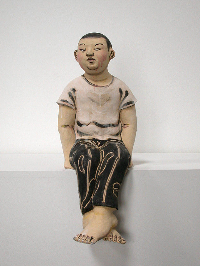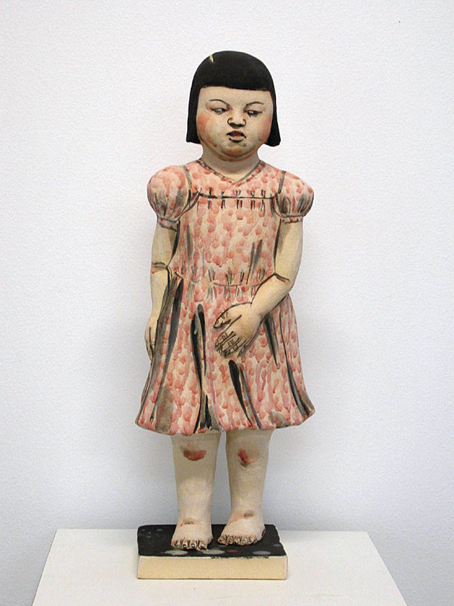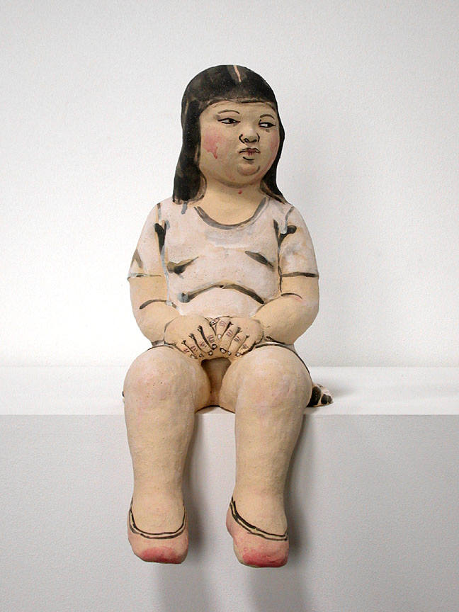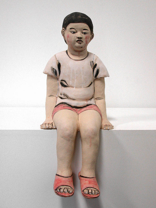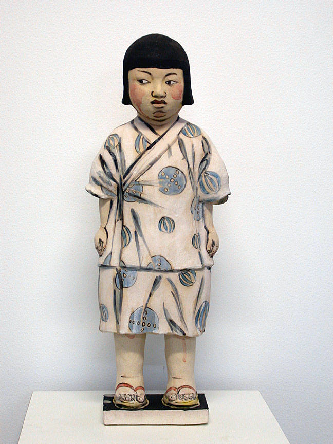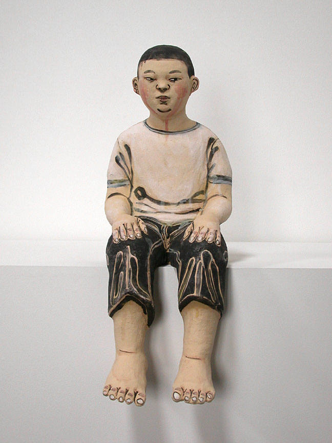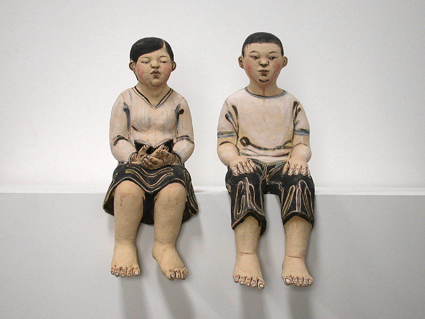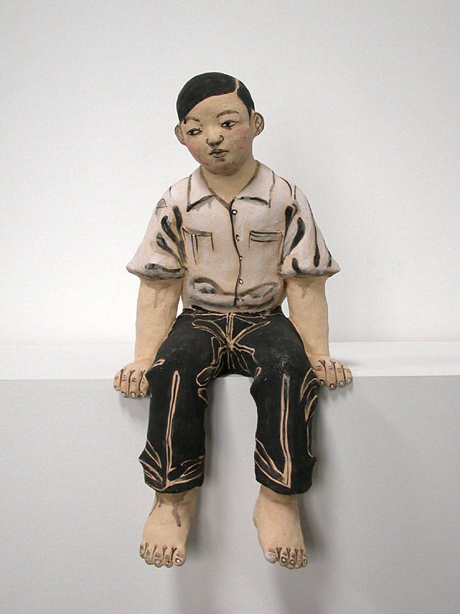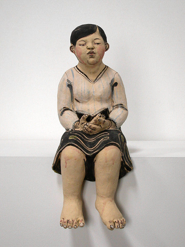 During the past summer, the artist encountered many students and children in an international ceramics studio in Hungary. Takamori made seven seated figures of young students, who are attentive and sitting together. The grouping will be shown in the center of the main gallery. In contrast, smaller standing figures of children will be exhibited with digital photo images. Both new groupings display Takamori's uncanny ability to marry a loose, brushy network of line and subtle color with solid figurative form.