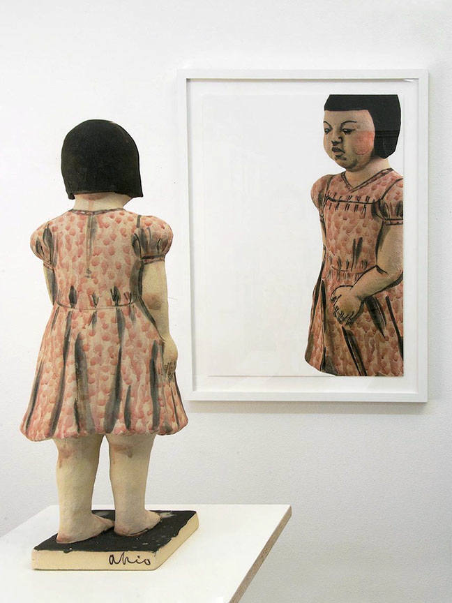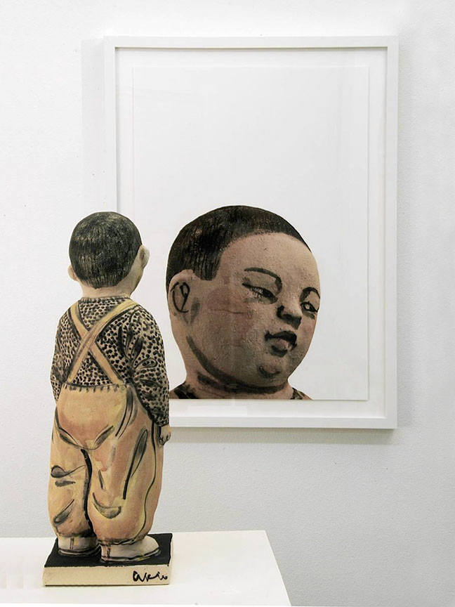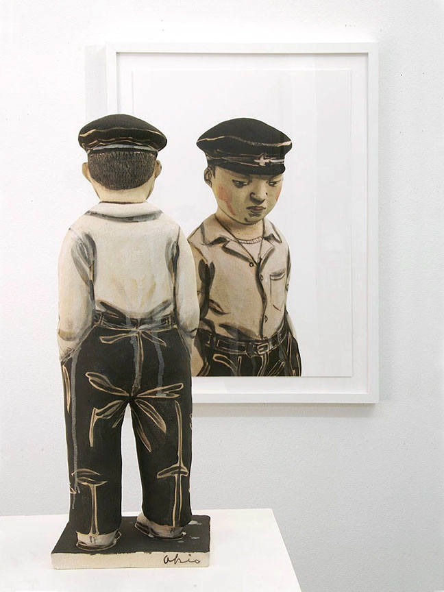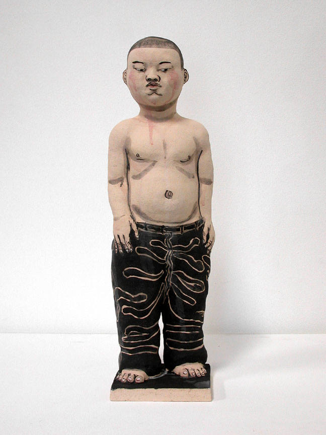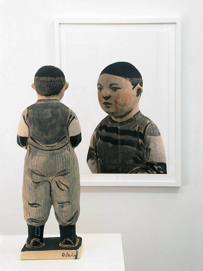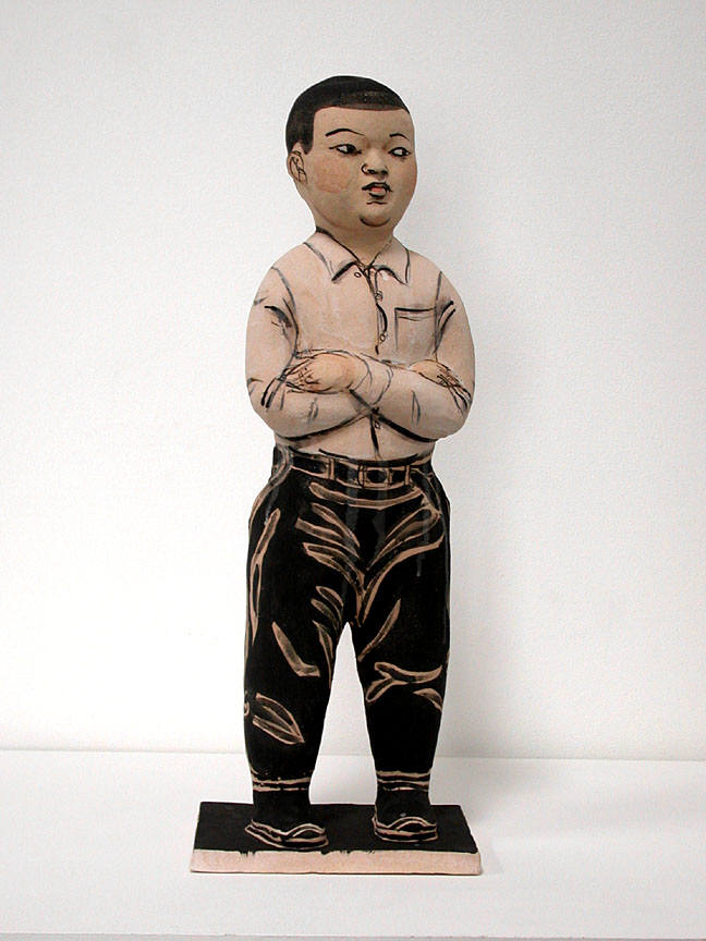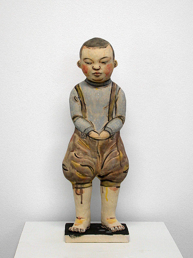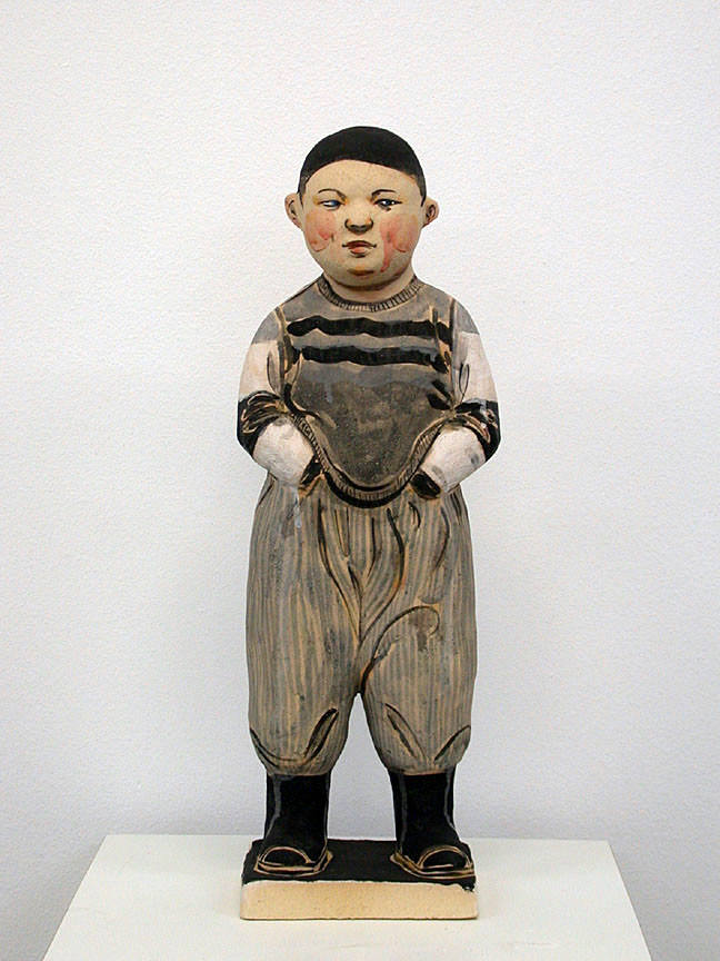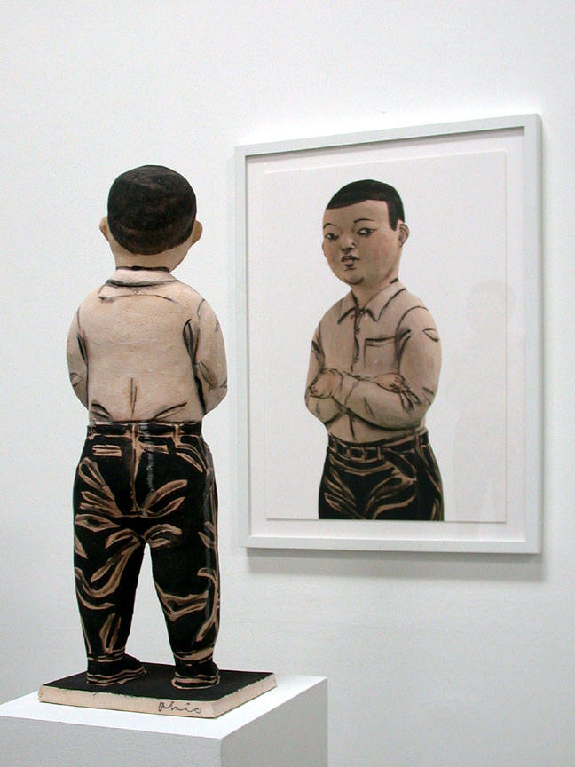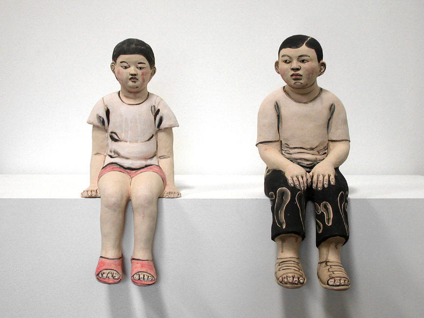 During the past summer, the artist encountered many students and children in an international ceramics studio in Hungary. Takamori made seven seated figures of young students, who are attentive and sitting together. The grouping will be shown in the center of the main gallery. In contrast, smaller standing figures of children will be exhibited with digital photo images. Both new groupings display Takamori's uncanny ability to marry a loose, brushy network of line and subtle color with solid figurative form.