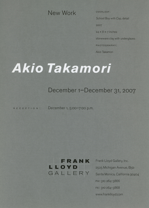 The Frank Lloyd Gallery is pleased to announce an exhibit by ceramic sculptor Akio Takamori during the month of December. In two installations of new figurative sculpture, Takamori continues to investigate communities, this time focusing on youth and a group of students. The students are both observant and self-reflective, and include small figures engaged in looking at their own portraits.