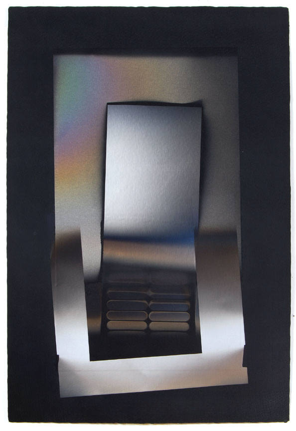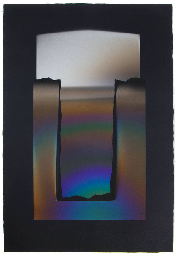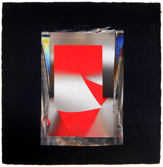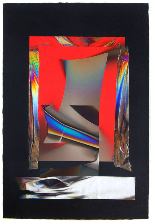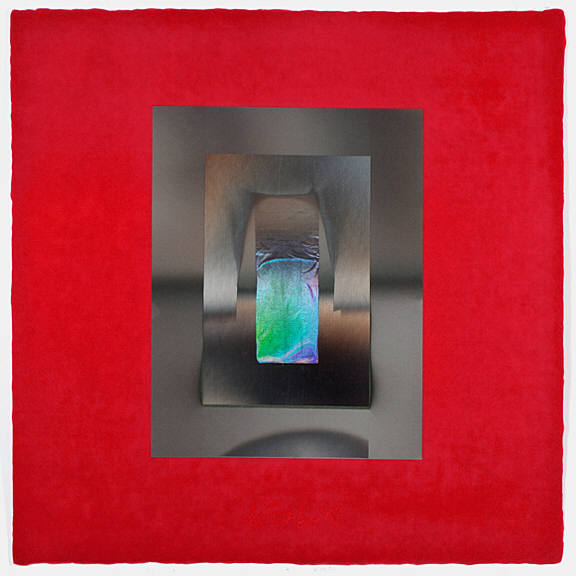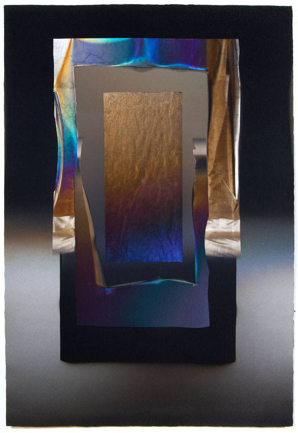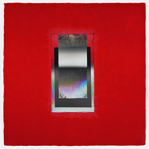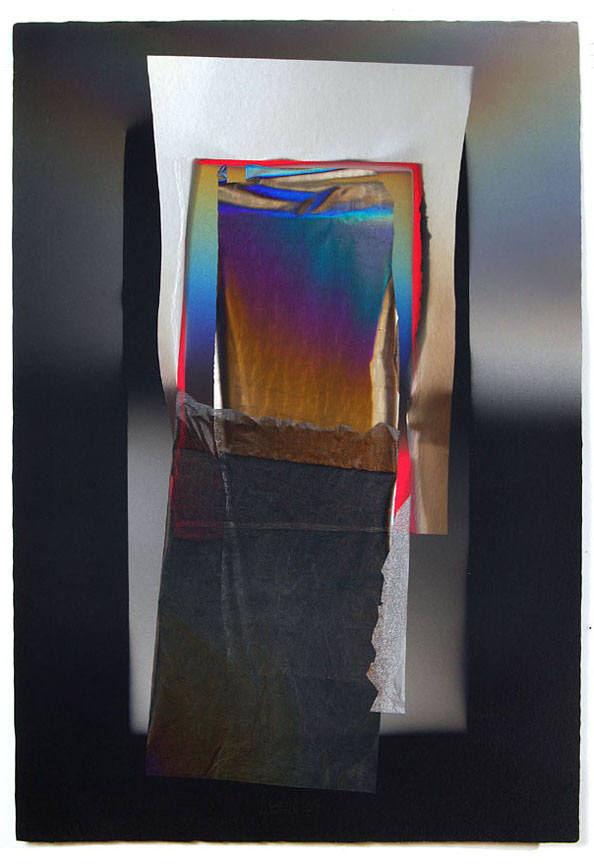 Larry Bell, best known for his investigations of the complexities of highly refined surface treatments of glass, has an extensive history with collage, as well. The recent works on paper, made by a process of laminating layers of film, acetate and paper, incorporate the artist's phenomenal sense of space and illusion. The works are also infused with rich color relationships, and saturated with metallic iridescence. The artist has used large sheets of handmade paper from Japan.