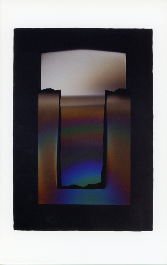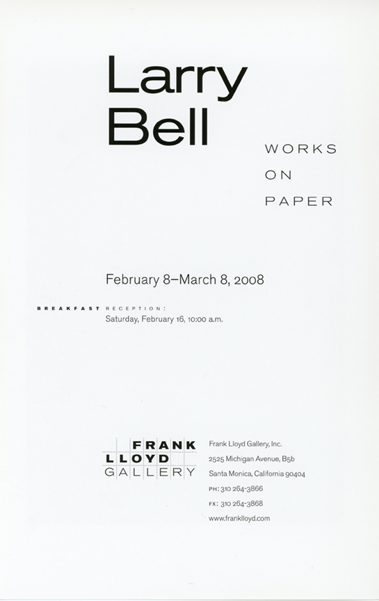 Recent works on paper by Larry Bell will be presented at Frank Lloyd Gallery from February 8 through March 8. The dramatic collage works display an expansive spatial sensibility. Bell's illusionistic space is complemented by a dense array of color, achieved by his use of vaporized metallic particles on the surface of the collaged elements. All works are mixed media on paper, the next step in the artist's continuing and inventive process.