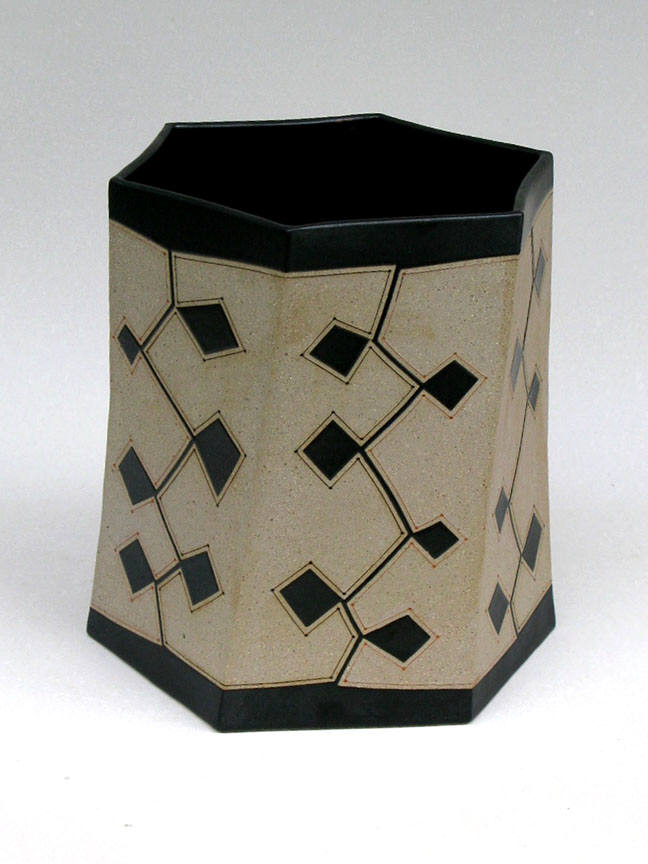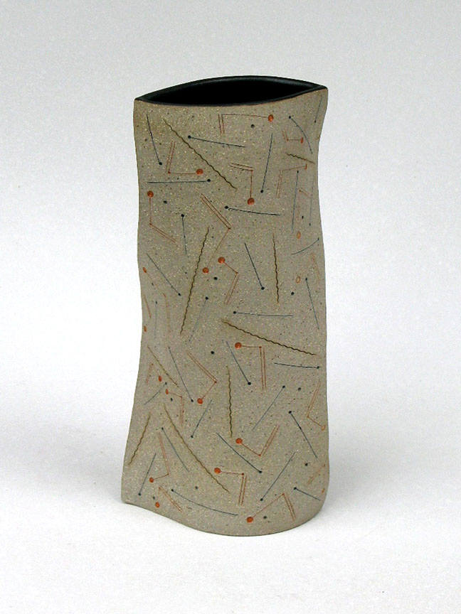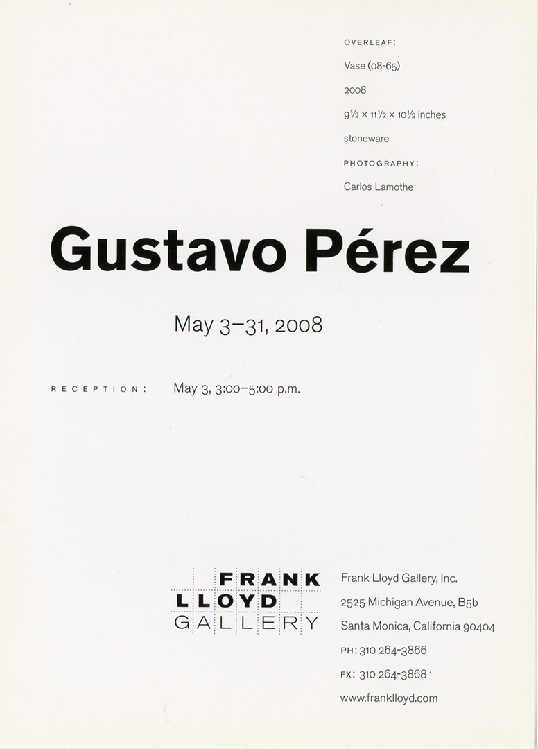 Gustavo Pérez has been showing in Los Angeles since 1999. For his sixth show at the Frank Lloyd Gallery, the ceramic sculptor exhibits a new series of work that incorporates surface drawing on thin cylindrical vessels. Bold patterns and striking compositions are balanced with symmetry and reversals. The ceramics of Gustavo Pérez are distinguished by eliminating superfluous details and by synthesis of his elements. During the past two decades he has created a visual language that seems closely aligned with music.