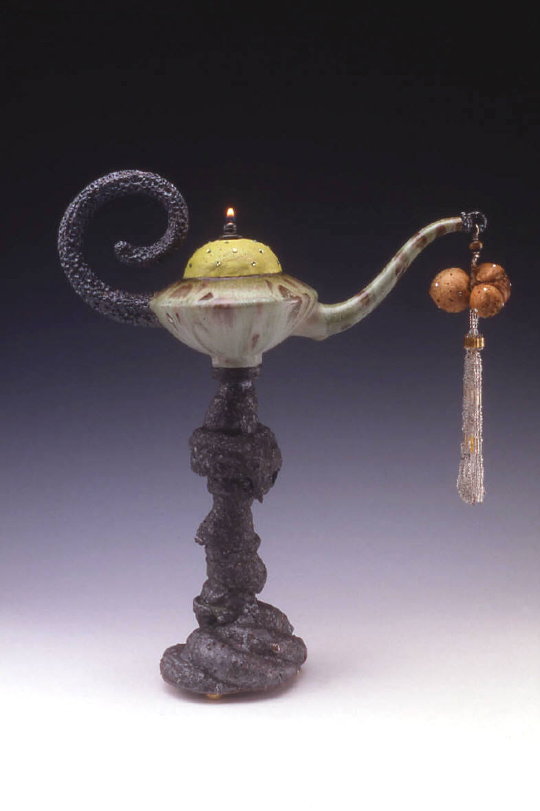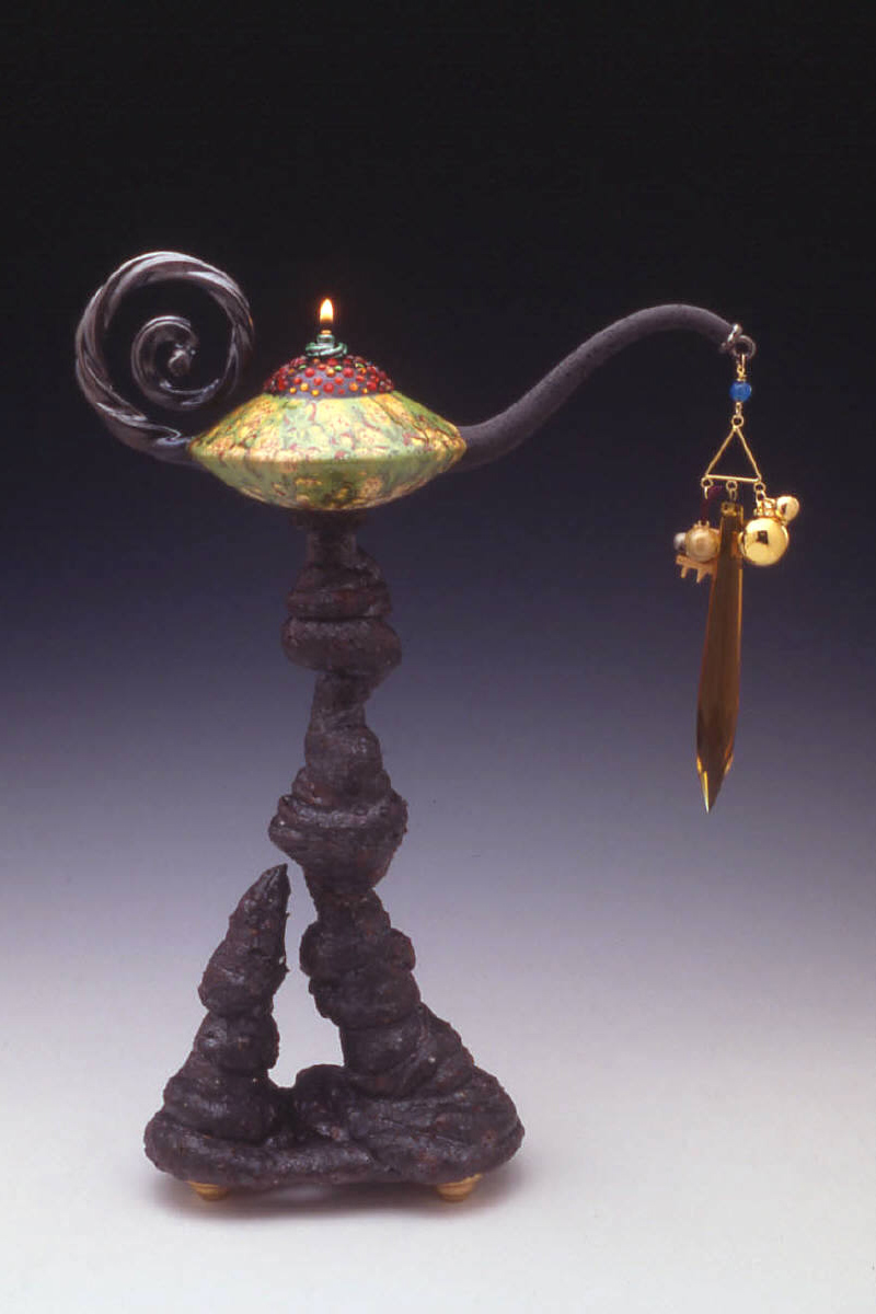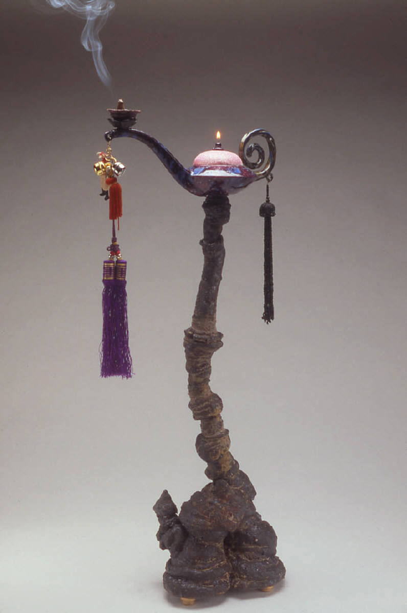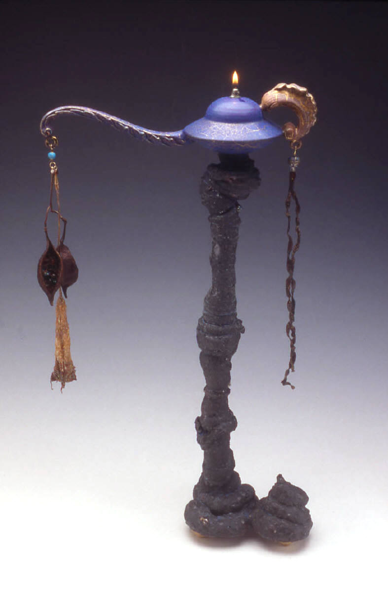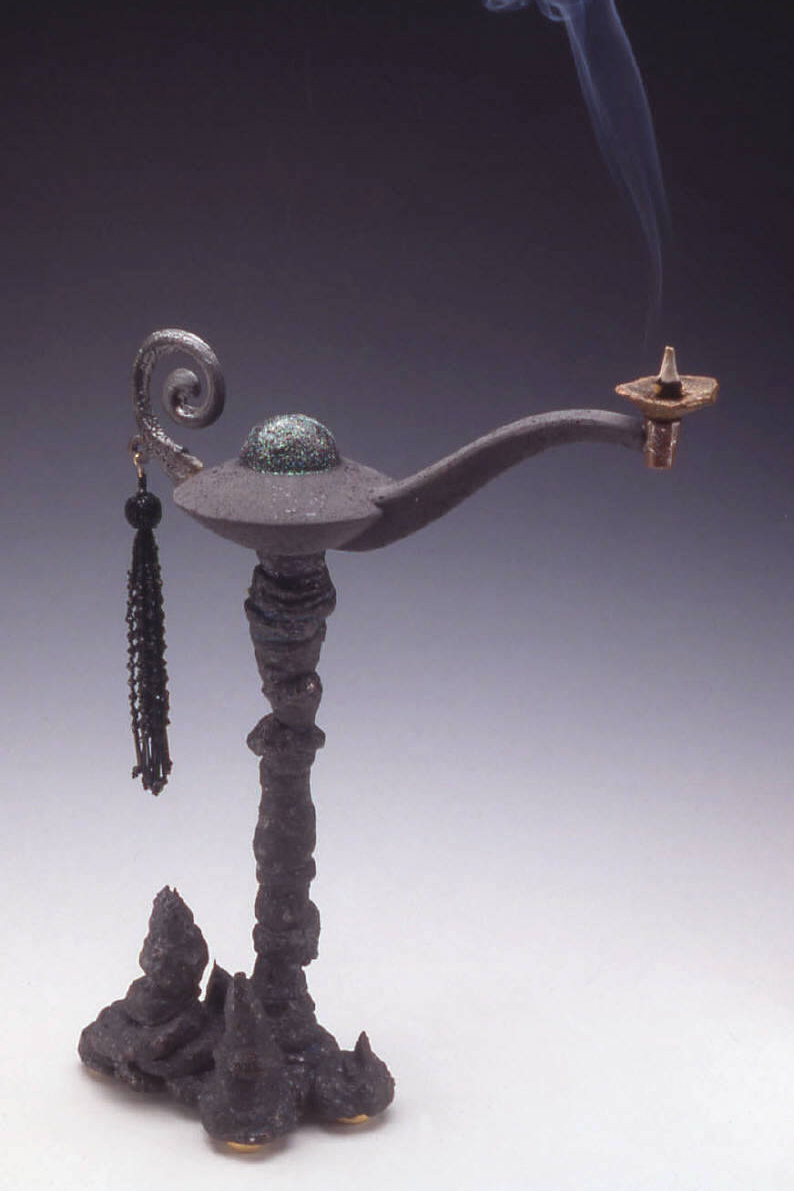Although these works are so ravishing that all they have to do to get your attention is sit around and look gorgeous, they also burn oil or incense (or both). When lit, the silhouettes of Saxe’s lamps overshadow their surface details, transforming them into spindly figures that recall Giacometti’s skeletal sculptures, which also cast long, haunting shadows. Marrying highbrow references from art history to lowdown, in-the-gutter humor, Saxe’s stunning sculptures are masterpieces in which beauty and utility intermingle as they draw you into their charmed world.