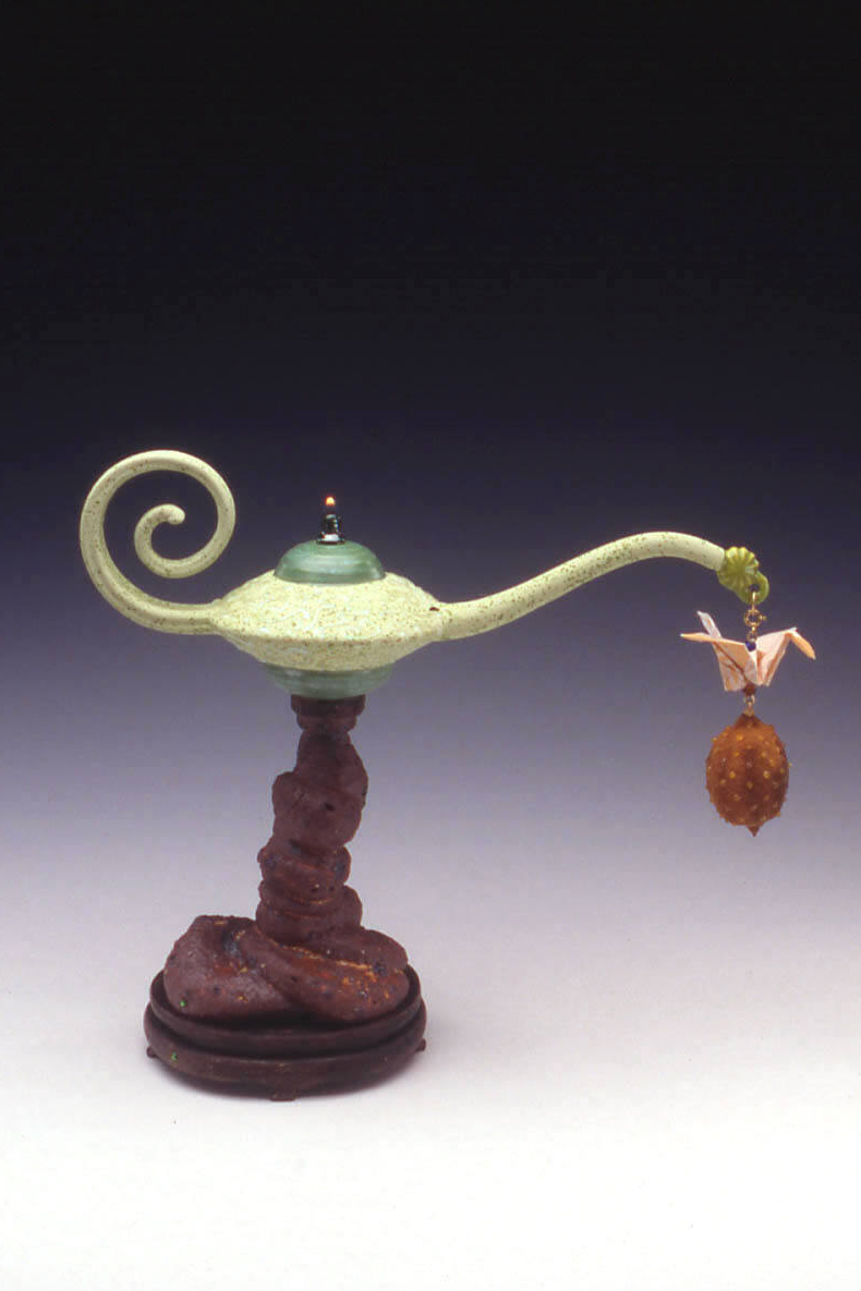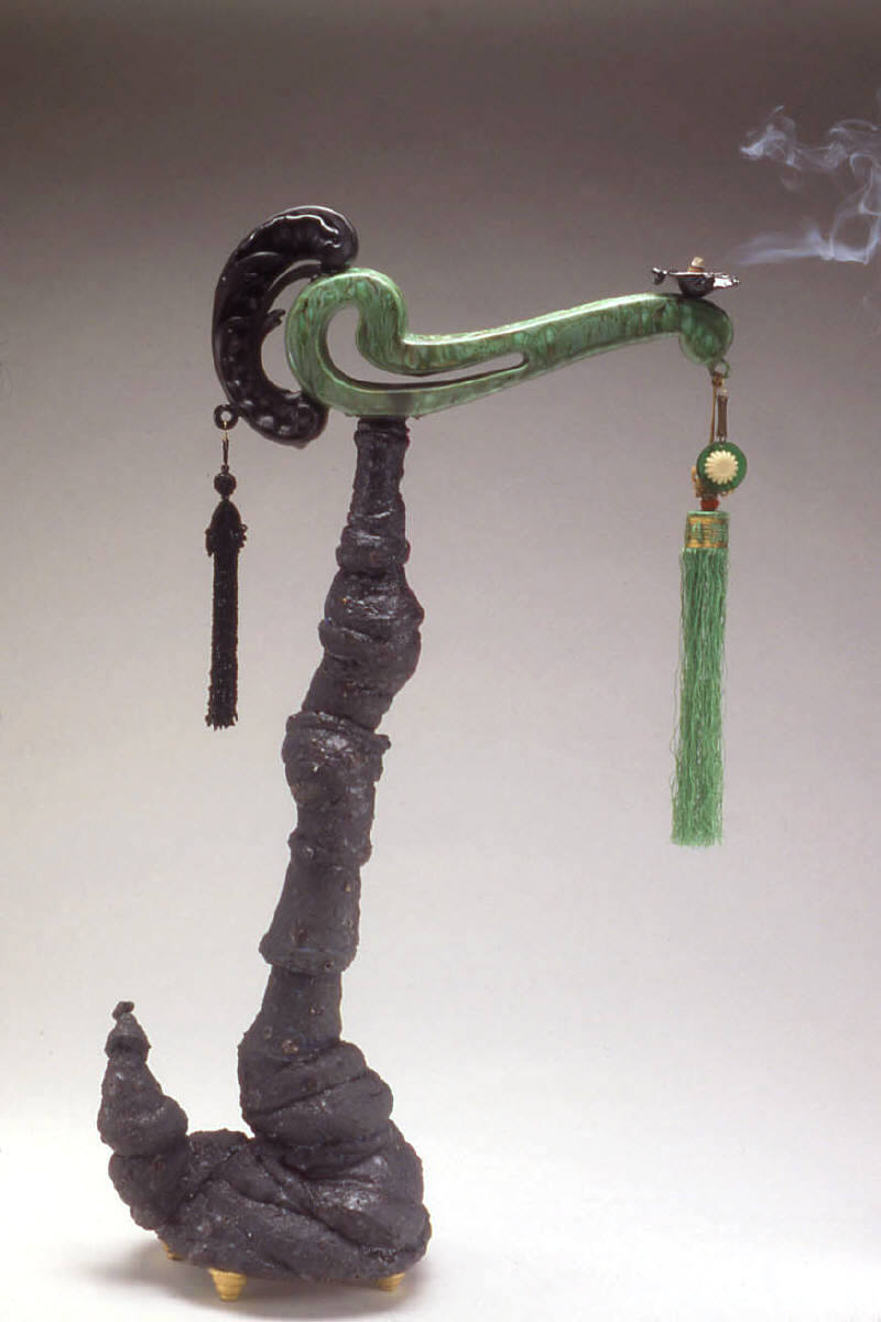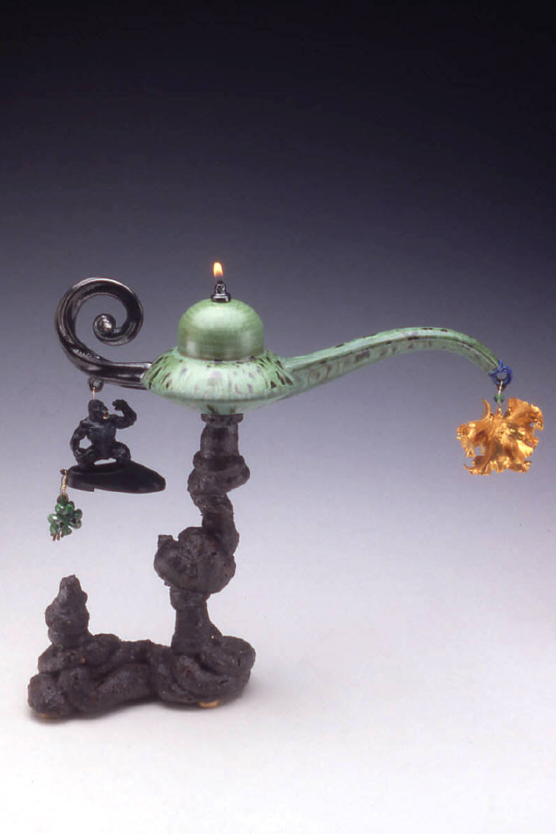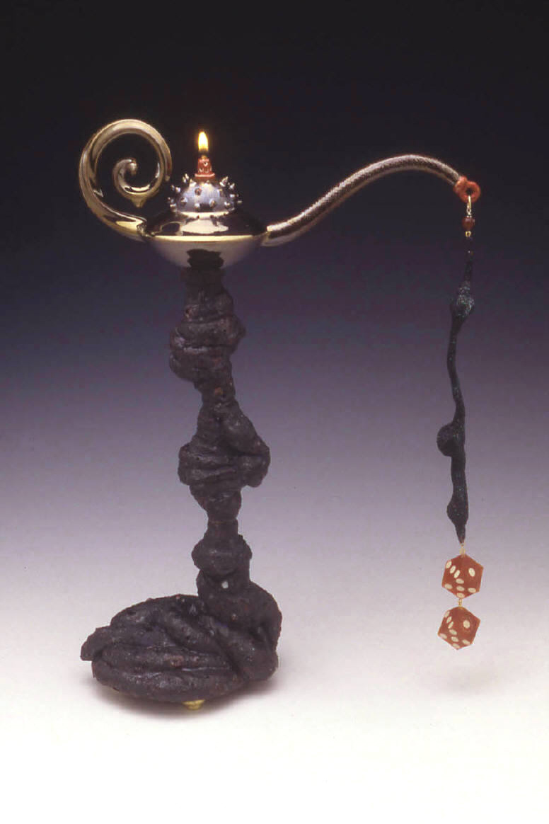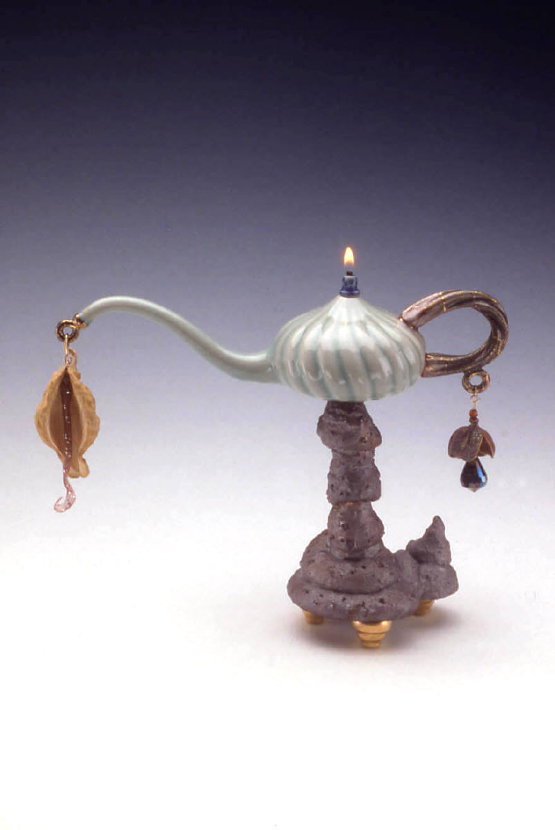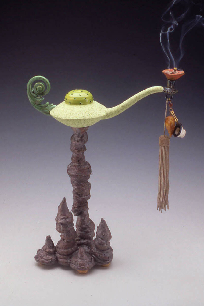 Although these works are so ravishing that all they have to do to get your attention is sit around and look gorgeous, they also burn oil or incense (or both). When lit, the silhouettes of Saxe’s lamps overshadow their surface details, transforming them into spindly figures that recall Giacometti’s skeletal sculptures, which also cast long, haunting shadows. Marrying highbrow references from art history to lowdown, in-the-gutter humor, Saxe’s stunning sculptures are masterpieces in which beauty and utility intermingle as they draw you into their charmed world.