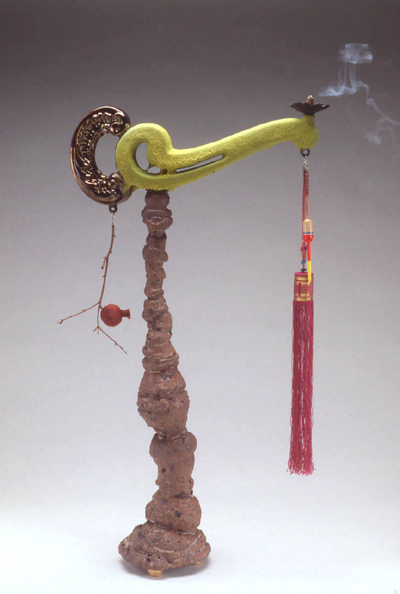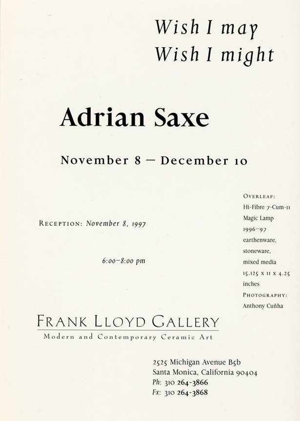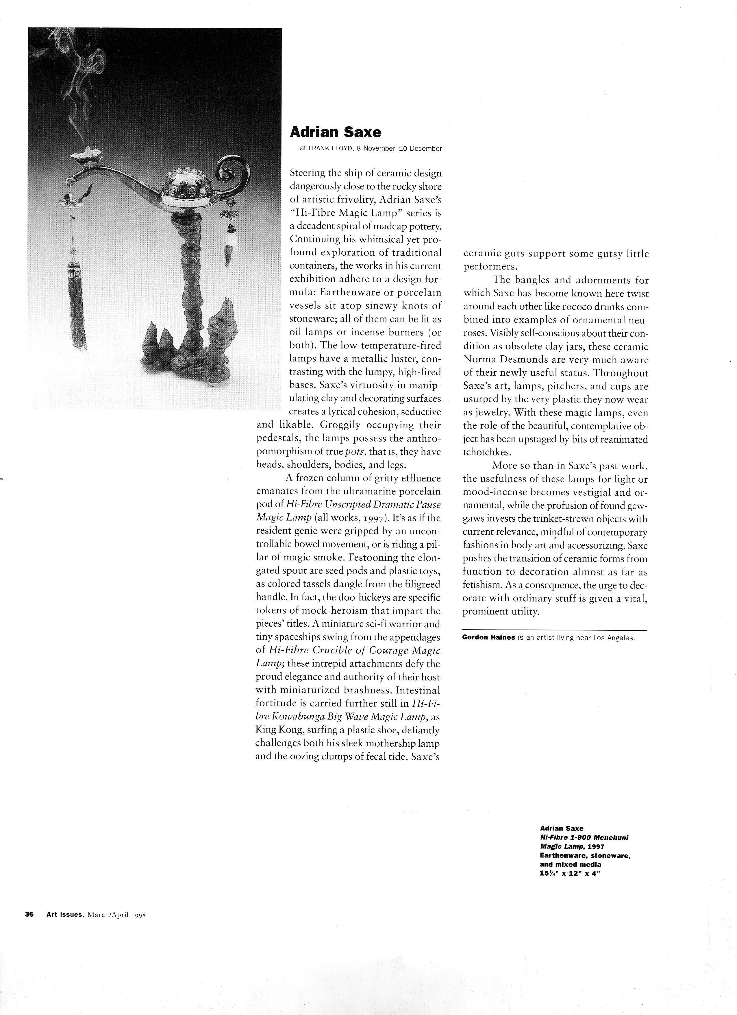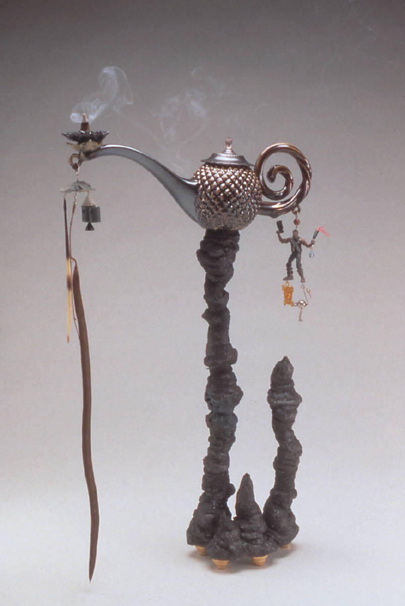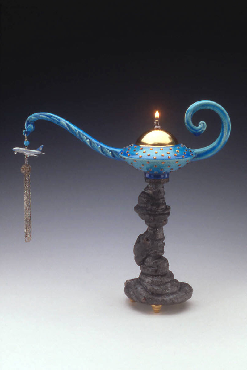 Although these works are so ravishing that all they have to do to get your attention is sit around and look gorgeous, they also burn oil or incense (or both). When lit, the silhouettes of Saxe’s lamps overshadow their surface details, transforming them into spindly figures that recall Giacometti’s skeletal sculptures, which also cast long, haunting shadows. Marrying highbrow references from art history to lowdown, in-the-gutter humor, Saxe’s stunning sculptures are masterpieces in which beauty and utility intermingle as they draw you into their charmed world.