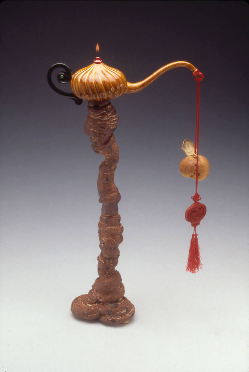 Each of Saxe’s magic lamps stands on a nasty, earth-toned clump of stoneware that looks like feces. Perched coquettishly atop these swirled masses of petrified clay are delicate vessels made of porcelain or earthenware.