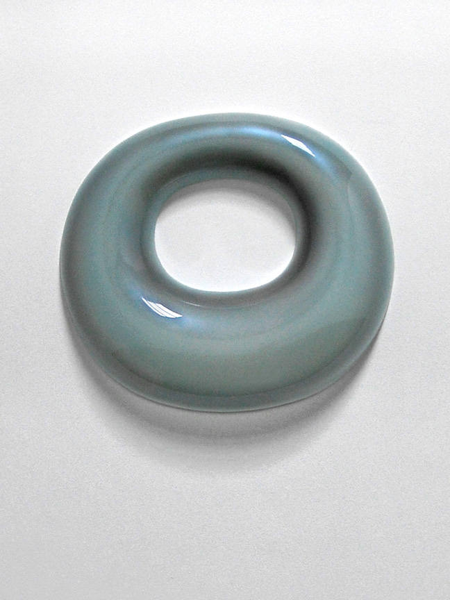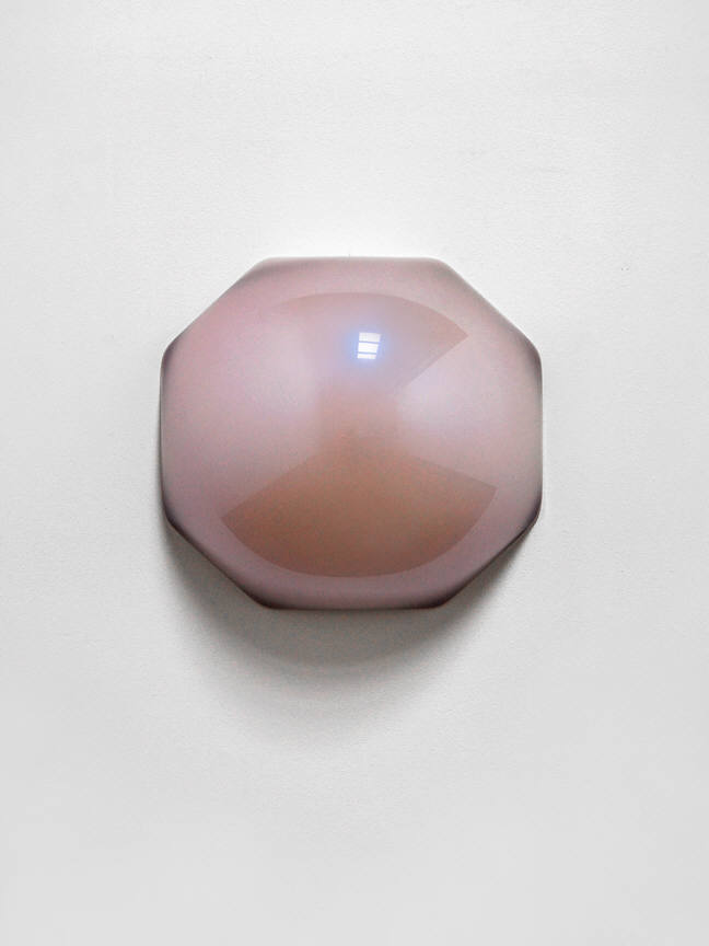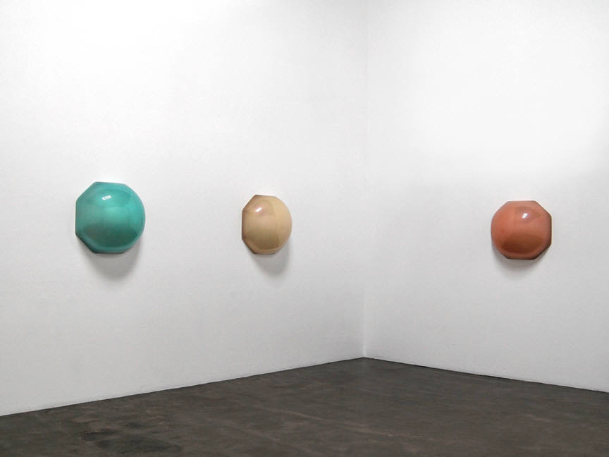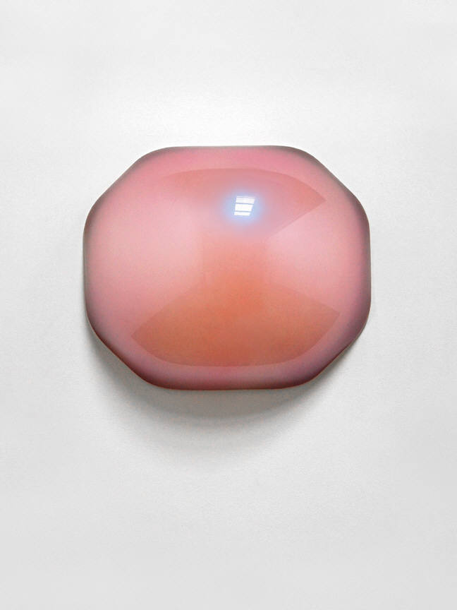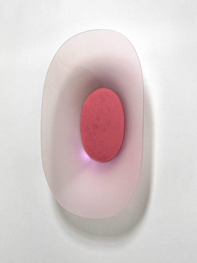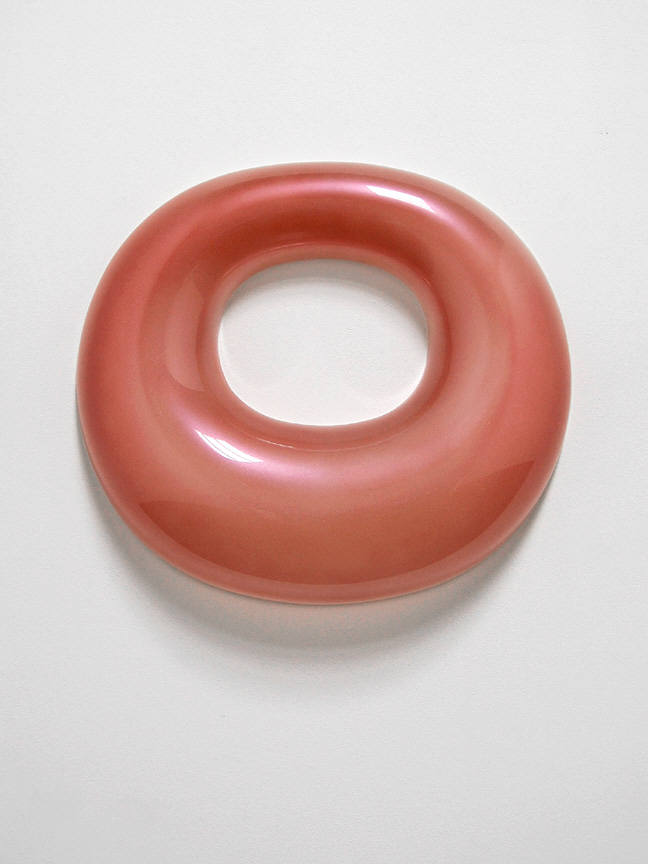 Playfully known as Bubbles, Donuts, and Dishes, all works are convex or concave ovals and protrude from the wall. The Bubbles have eight sides and form a hemisphere. The exhibit will also include wall reliefs in the shape of a doughnut, and others from a series containing flat oval centers and raised walls—the Dishes. The deftly painted works are infused with rich color relationships, and saturated with metallic iridescence.