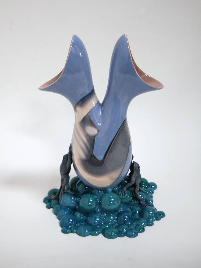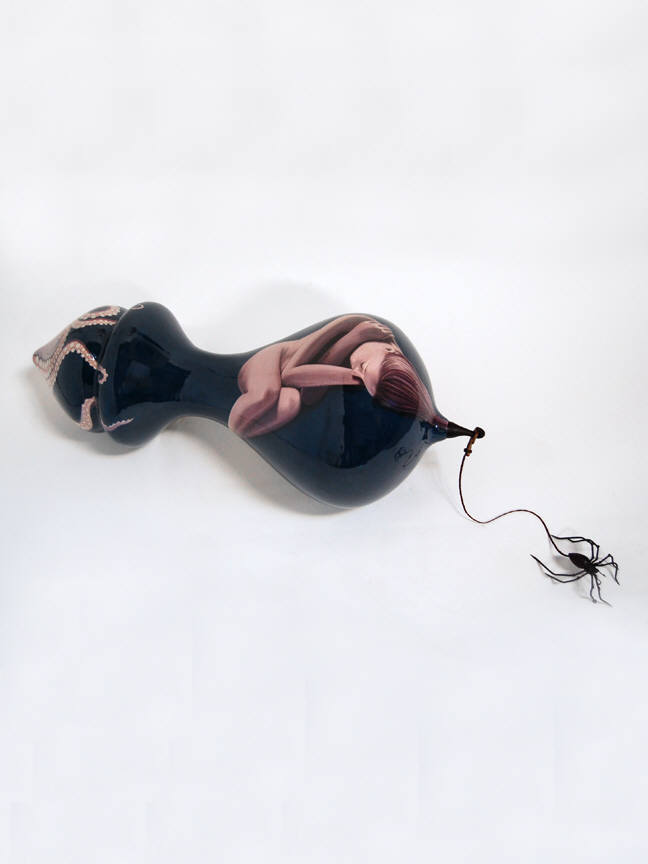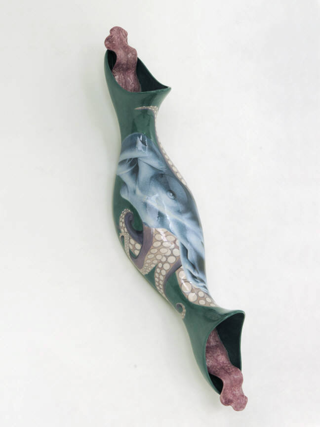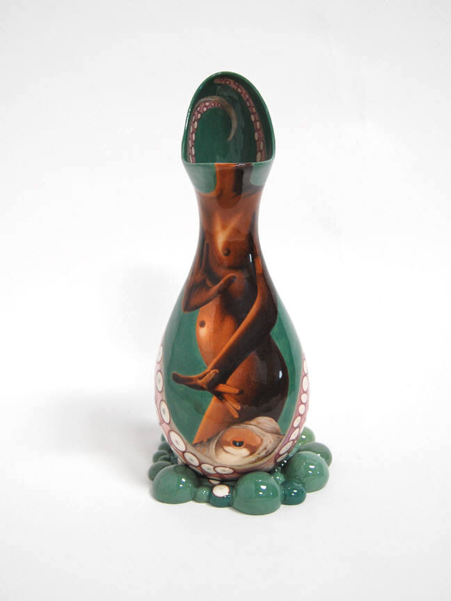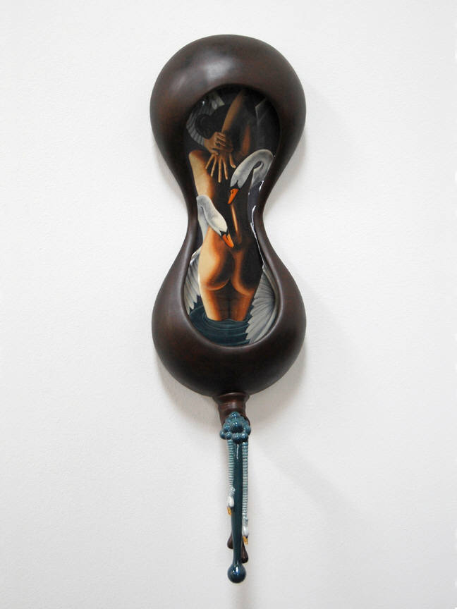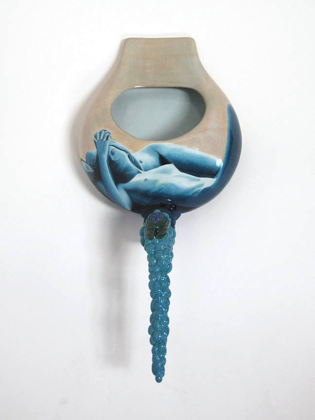 Cindy Kolodziejski continues to make vessels by recombining and manipulating antique urinal forms. Not to leave out other areas of excretion, the bed pan has also made an appearance in her current body of work. Kolodziejski starts with these unusual antiques and adds layers of imagery and metaphor. In addition to the provocative use of a container for bodily fluids, the artist entices the viewer by adding the tentacles of an octopus. The interiors and exteriors of the vessels are glimpses of couples engaged in sexual activity. Juxtaposing octopus with coitus or a swan orgy, Kolodziejski sets up an unusual tension. There are mixed references to the water world throughout—including octopus tentacles, frogs, swans and bubbles. Delving into the sexual psyche, the works have a mysterious brew of exquisitely rendered images.