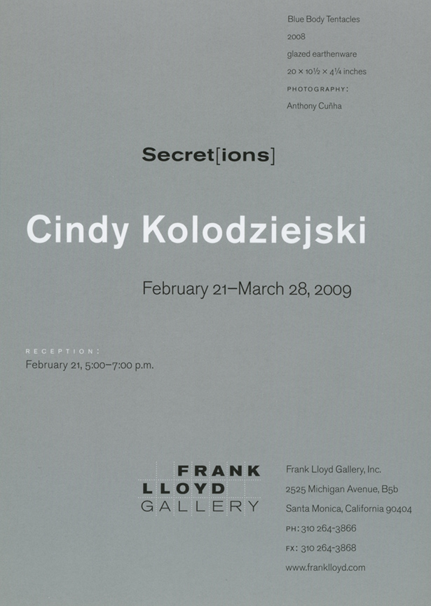 Cindy Kolodziejski lives and works in Venice, California. Born in Augsburg, Germany, Ms. Kolodziejski has had fifteen one-person shows since 1986. Her work is in the collections of the Los Angeles County Museum of Art, the Long Beach Museum of Art, and the Newark Museum, among others.