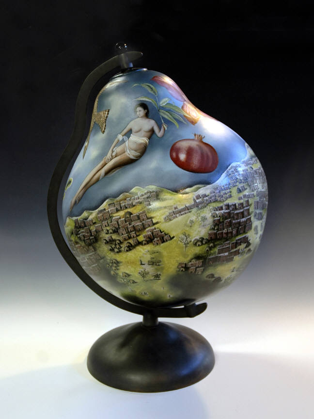 The Frank Lloyd Gallery is pleased to announce one-person exhibitions by Cindy Kolodziejski and Kurt Weiser. Kolodziejski and Weiser are highly skilled in painting on the ceramic surface, and deftly deal with the formal issues of painting on a curved shape. Both artists use contemporary ceramic forms as a support for figurative painting. While Cindy Kolodziejski continues to explore the fertile territory of human sensuality, Kurt Weiser pushes into a surreal and fantastic world on his odd-shaped globes.