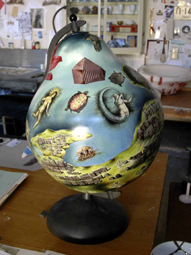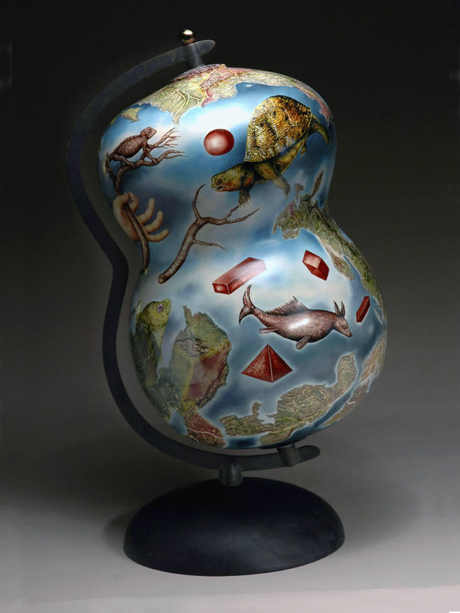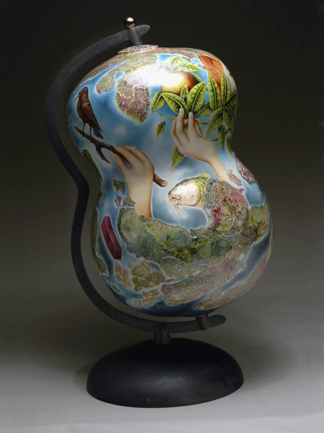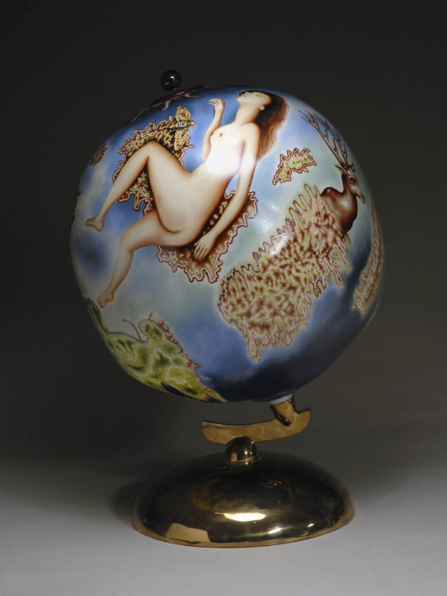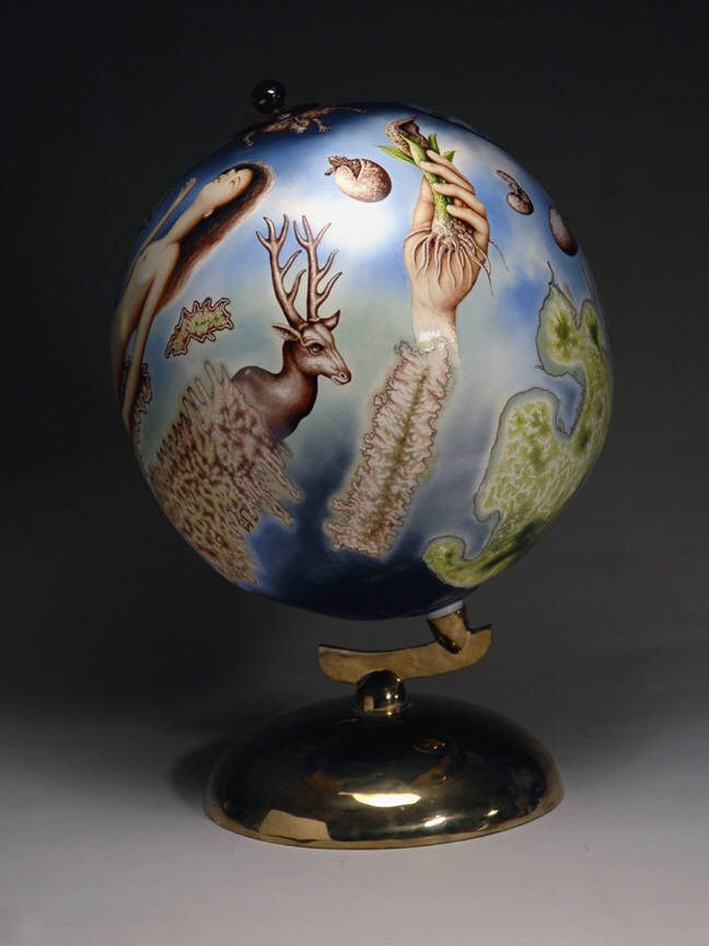 Kurt Weiser has expanded his worldview onto globes. Bronze stands hold the oddly curved, almost pear-shaped orbs. He builds all of the elements for the works, and casts the porcelain as well as the bronze. The bending and flowing imagery has been described by Edward Lebow: "Weiser's dog-eat-dog world is awash in odd sexual and scientific tensions between wanting and having, desire and controlling, seeing and seizing." Weiser's own statement is modest: