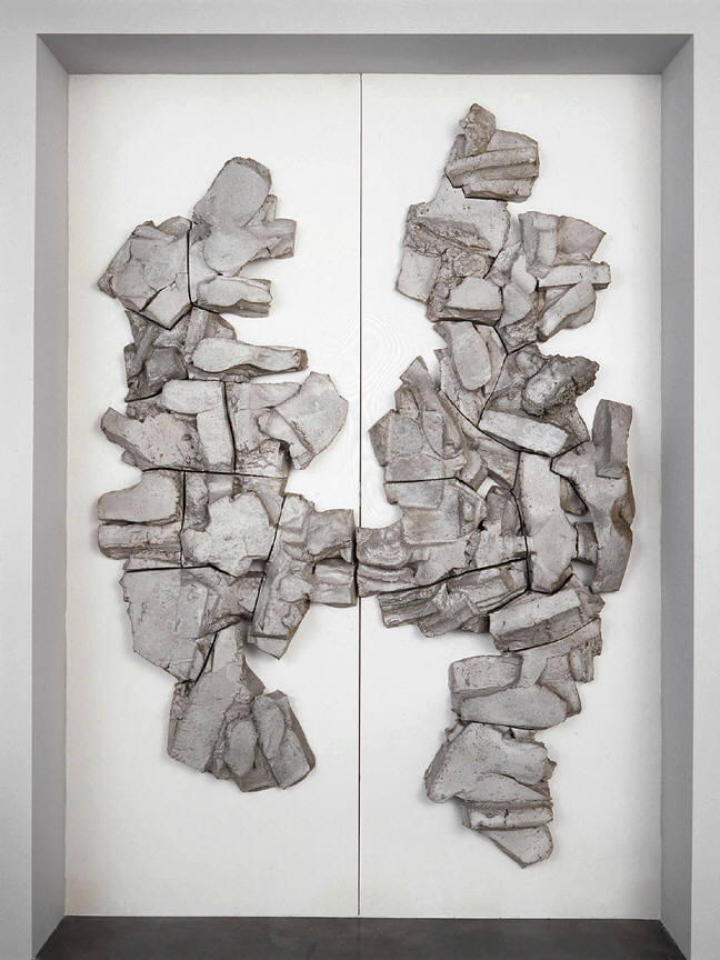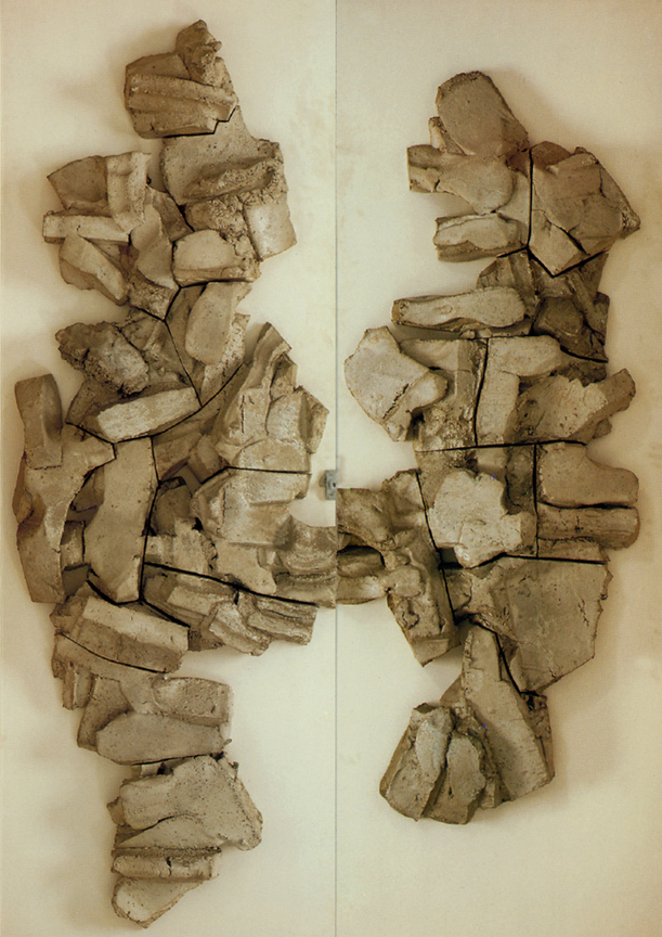 Pottery meets sculpture in these objects, but pottery is not converted into sculpture. Instead, a dialectic is undertaken between terms from two fields: volume and mass, decoration and expression, pragmatism and aesthetics. Like Voulkos, Mason also invested clay with a certain "primitive" energy, but it's best to put that word in quotation marks because in his case primitivism reads more like a design motif than s shot of testosterone. His Untitled Doors (1962) are tiled with thick blocks of clay that create an ersatz rock formation. The "faux" quality may look a little naïve to modern sensibilities, but as an example of one era's tastes, it practically glows with energy.