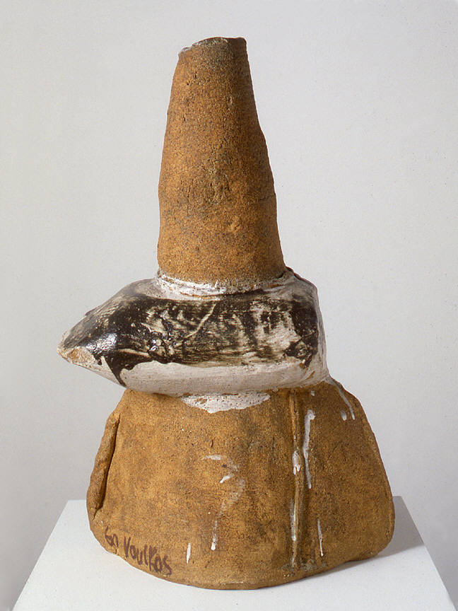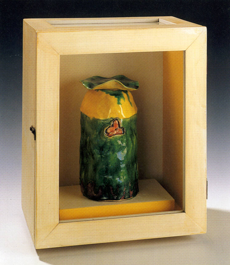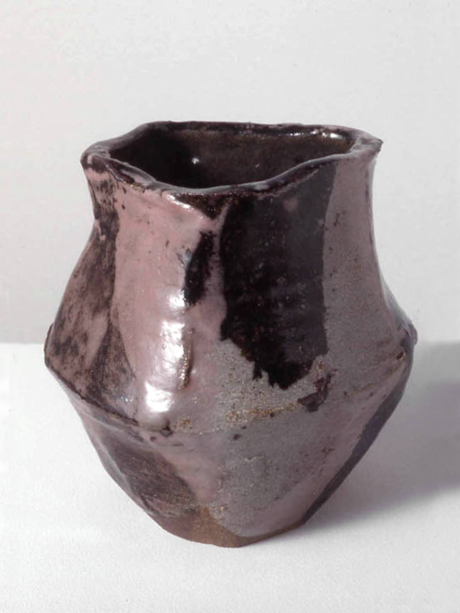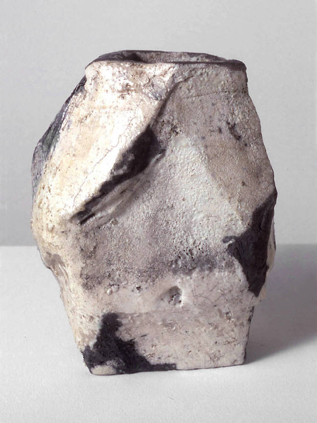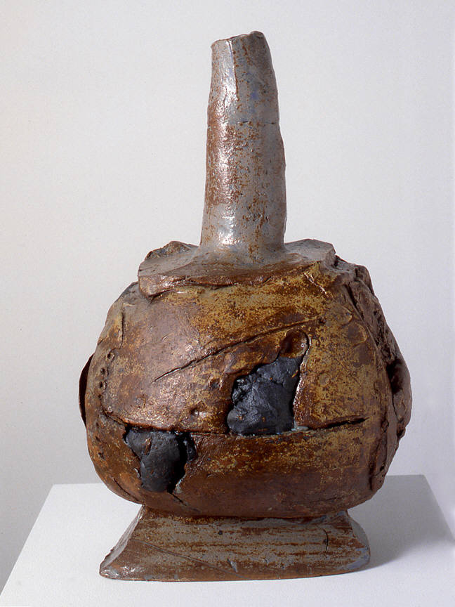 An aggressively sexual vase seems more at home among cannonballs than blossoming flowers. And the third, untitled work, whose surface has the texture of a crude burlap sack, slumps casually on a shelf—as if lying in wait for the next unsuspecting viewer who prefers the utility of conventional crafts to the risky unpredictability of art.