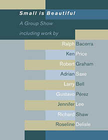 This online catalogue documents the group exhibition Small is Beautiful, featuring works by Ralph Bacerra, Larry Bell, Roseline Delisle, Robert Graham, Robert Hudson, Jennifer Lee, Ron Nagle, Gustavo Pérez, Ken Price, Adrian Saxe and Richard Shaw. Presenting a selection of small-scale artworks in ceramics and other media, this exhibition privileges the intimacy of objects that can be held in one's hands, or that bear evidence of their own production.